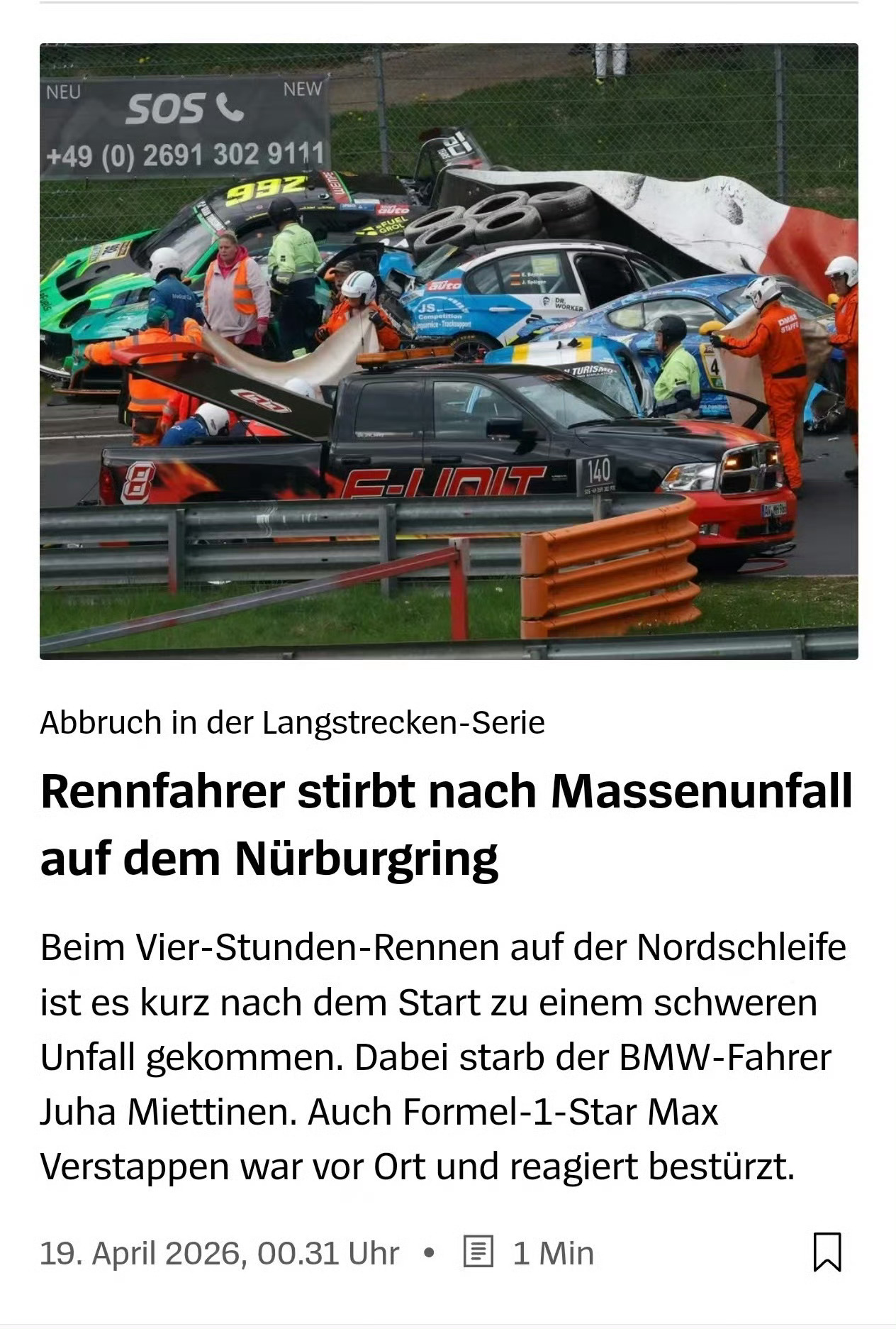 赛车本身就是很高危的运动,车手用自己的驾驶技术去压榨赛车的性能,追求更快的速度和成绩。而赛车制造商也会尽全力去保障车手安全。但是总会有突破「极限」和无可奈何的时刻,当然反向也会push出应对的安全设计……逝者安息,也敬佩他66岁依旧在赛场上飞驰纽北事故
