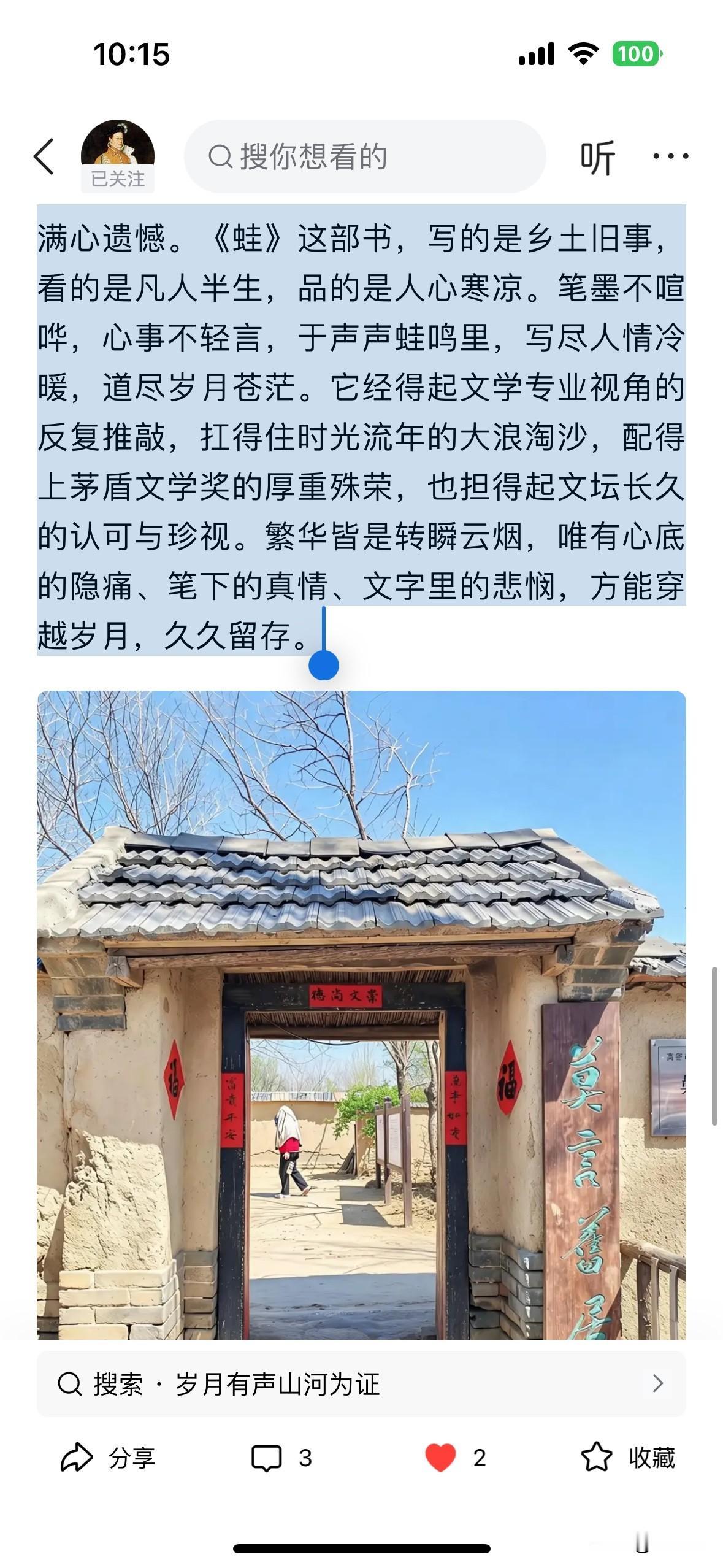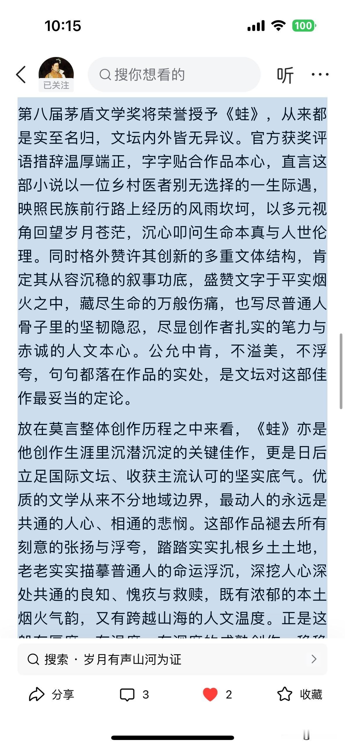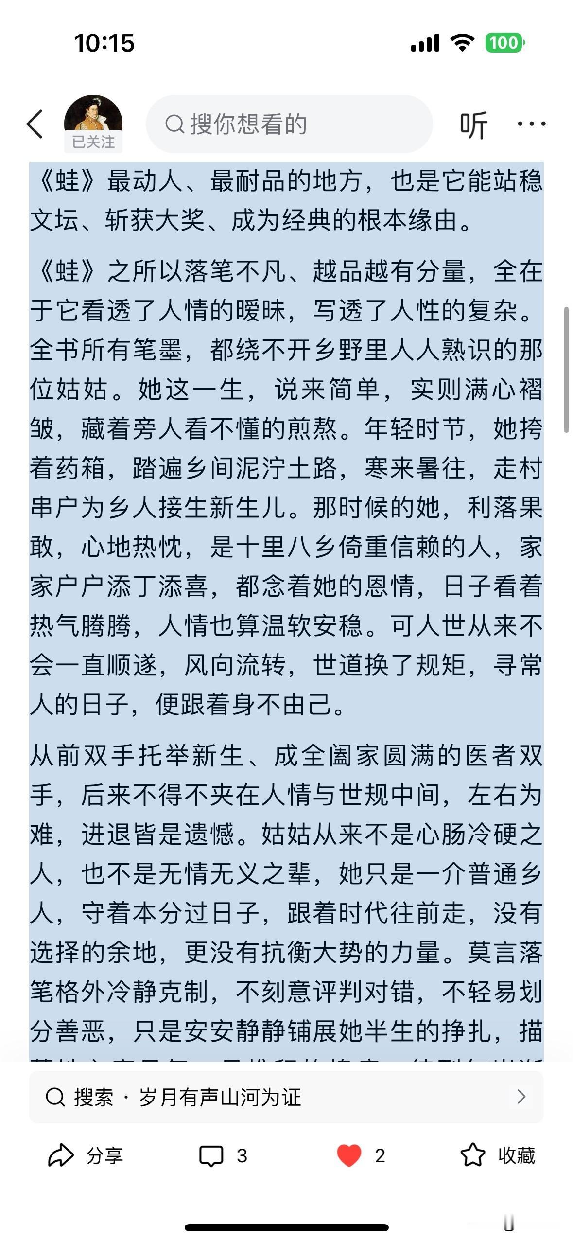逆入藏锋先生的文笔特别优美,出手不凡,功力深厚,其行文结构严谨有序,从人物塑造、人性刻画,到文体创新、意象运用,再到奖项认可、文坛地位,由内而外、由文本到价值逐步递进,逻辑清晰且层次分明。评者深谙莫言创作精髓,聚焦姑姑的挣扎与救赎,不评判善恶,只共情命运,精准点出作品“写透复杂人性、藏尽隐忍悲凉”的核心魅力。对“蛙”这一核心意象的解读,既贴合乡土语境,又深挖精神内涵,尽显专业鉴赏力。
