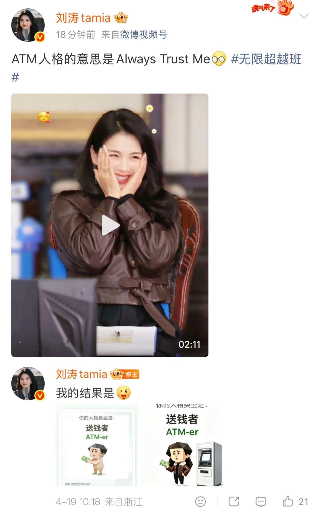 刘涛的ATM是AlwaysTrustMe谁能想到刘涛人格类型竟是ATM-er🥹而且她还说ATM是Always Trust Me的意思,这波解读我给满分💯在《无限超越班4》涛姐当监制不光严抓演技,私下更像一台情感ATM随时取之不尽的鼓励和温暖你永远可以相信刘涛从不让你失望~无限超越班