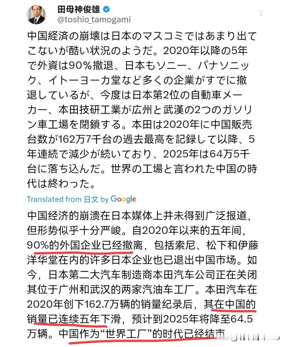 他给出的说法是,2020年之后的五年里,有90%的外资已经撤离中国,包括日本索尼、松下、伊藤洋华堂在内的大批日企,也都已经撤出中国市场;而此番日本第二大车企本田技研工业,更是即将关闭位于广州、武汉的两家燃油车工厂。
