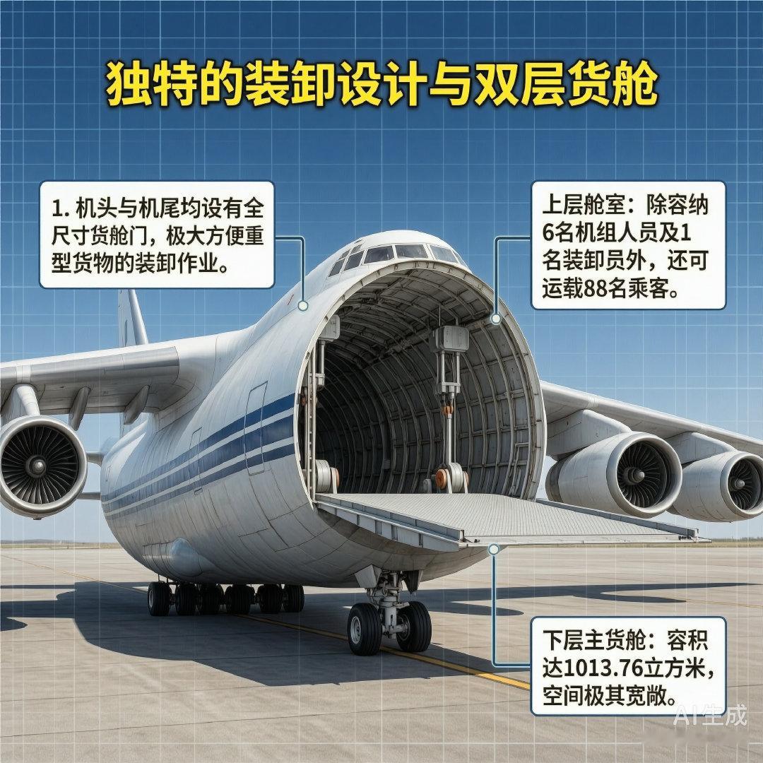 An-124机腹贴近地面,机头机尾均设计有全尺寸货舱门,方便装卸货物。其货舱分为上下两层。上层舱室较狭小,除6名机组人员和1名货物装卸员外,还可运载88名乘客。下层主货舱容积为1013.76立方米,载重可达150吨。货舱顶部装有2个起重能力为10吨的吊车,地板上还有2部牵引力为3吨的绞盘车。An-124装有4台推力为229.5千牛的D-18T涡扇发动机。