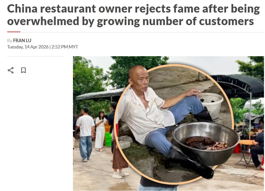 老莫走红后的反应让外国网友看懵了——他累倒在店里,贴出告示警告顾客"用餐可能会拉肚子",对着镜头说"以前每天10桌,关门唱卡拉OK,现在这种钱不值得"。马来西亚The Star在报道中特别提到,这与年轻人流行的"躺平文化"形成有趣呼应。