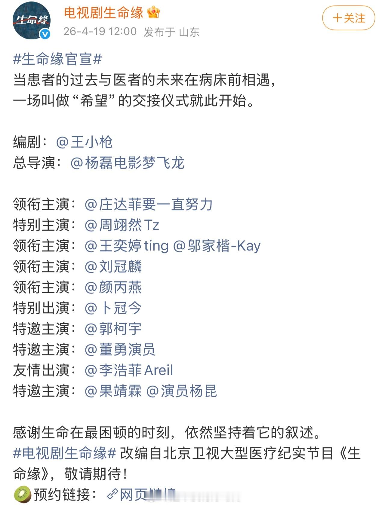 周翊然《生命缘》爱奇艺世界大会官宣特别主演周翊然是规培生夏朝阳,期待早日和大家见面周翊然周翊然