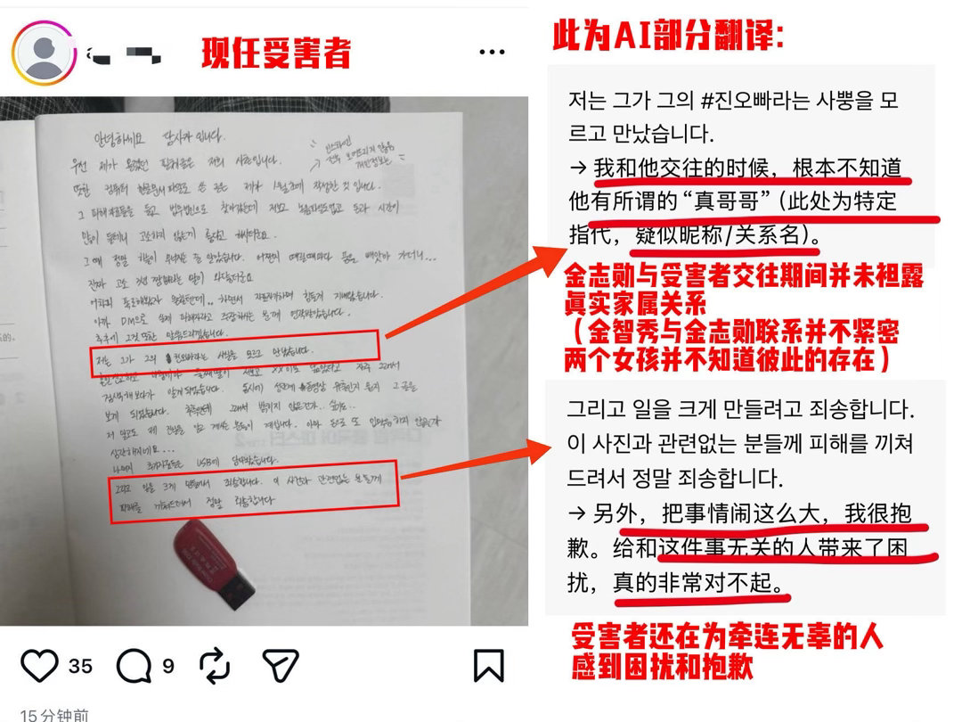 金智秀曾谈对家人的看法 ❌拒绝捆绑无辜❌拒绝二次伤害 ❗聚焦事件真相,拒绝恶意转移矛盾,还无辜者清白,还社会议题该有的关注❗ 把视线聚焦与施暴者金志勋 他有自己的名字金志勋,我们支持受害者拿起法律武器保护自己,我们支持施暴者被绳之以法