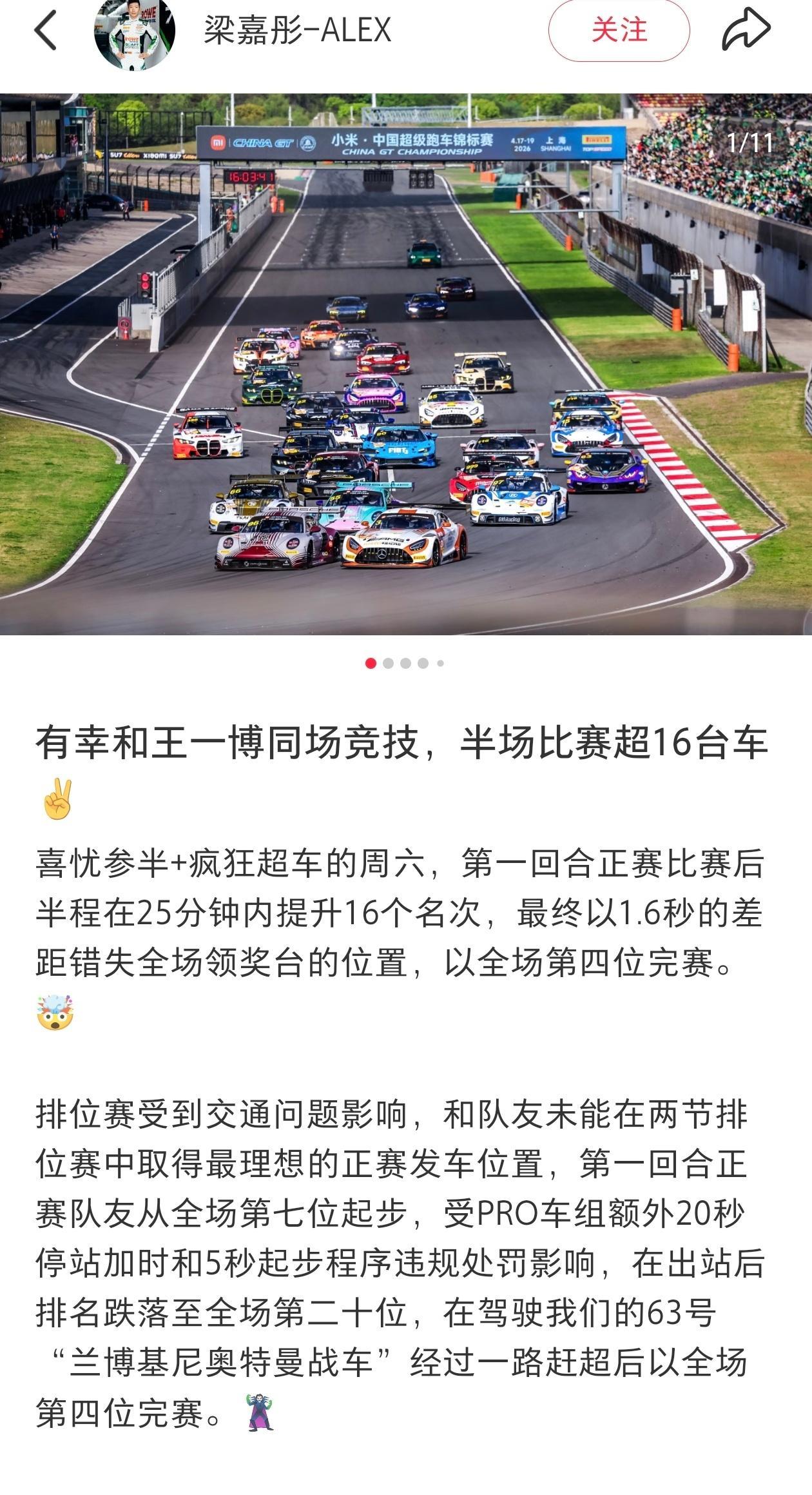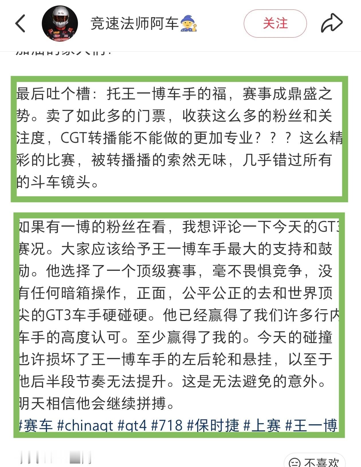 “如果有一博的粉丝在看,我想评论一下今天的GT3赛况。大家应该给予王一博车手最大的支持和鼓励。他选择了一个顶级赛事,毫不畏惧竞争,没有任何暗箱操作,正面,公平公正的去和世界顶尖的GT3车手硬碰硬。他已经赢得了我们许多行内年手的高度认可。至少赢得了我的。今天的碰撞也许损坏了王一博车手的左后轮和悬挂,以至于也后半段节奏无法提升。这是无法避免的意外。明天相信他会继续拼搏。”