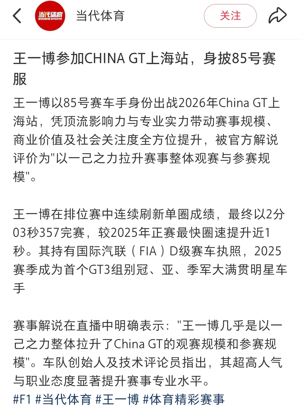 刚看到上海China GT组别冠军车手发文,直接说了大实话:托王一博的福,赛事卖爆了票,关注度直接拉满,粉丝也来了——这一波,是真的把GT3赛事带成了“鼎盛之势”。