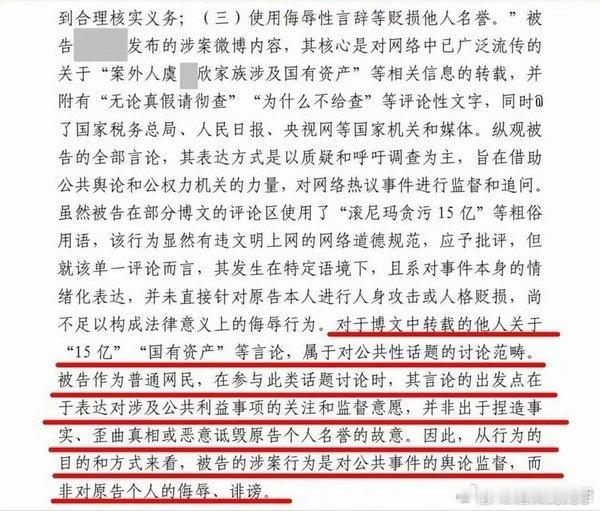 划重点:对于博文中转载的他人关于"15亿""国有资产"等言论,属于对公共性话题的讨论范畴。被告作为普通网民,在参与此类话题讨论时,其言论的出发点在于表达对涉及公共利益事项的关注和监督意愿,并非出于捏造事实,歪曲真相或恶意诋毁原告个人名誉的故意。因此,从行为的目的和方式来看,被告的涉案行为是对公共事件的舆论监督,而非对原告个人的侮辱,诽谤。