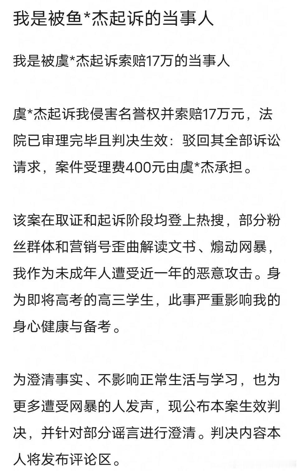 虞书欣爸爸起诉素人名誉侵权案索赔17万,法院判决虞书欣爸爸败诉
