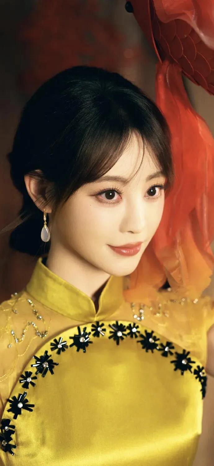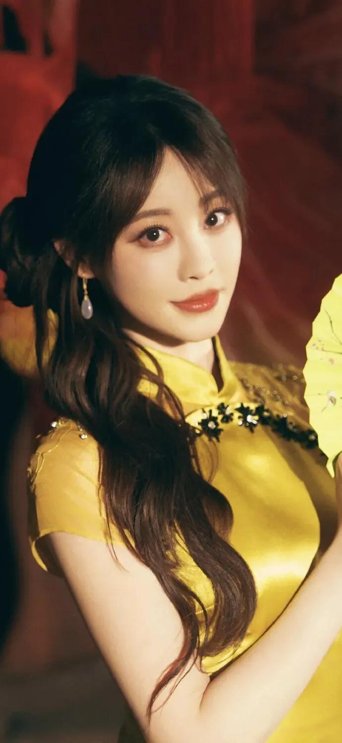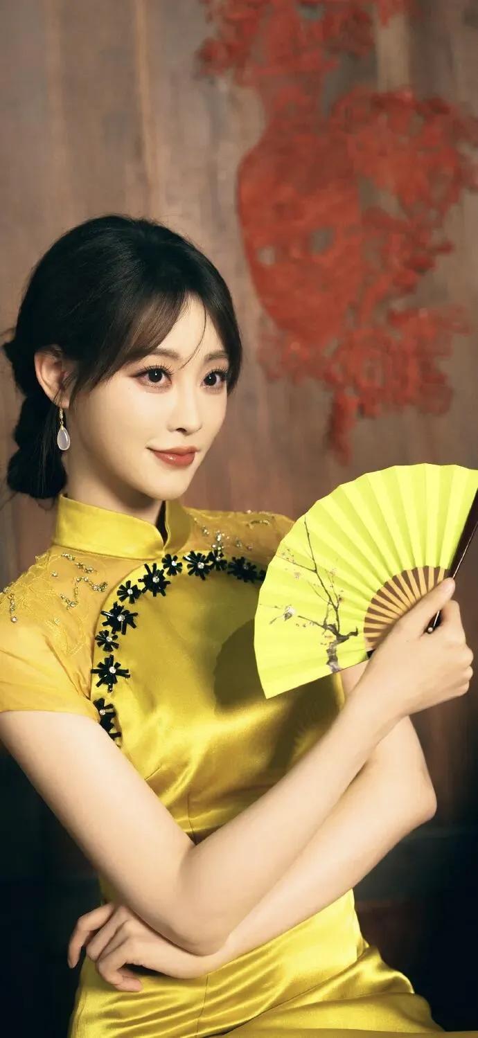 美女壁纸~祝绪丹,明黄缎面旗袍则晕开暖光,珠花与玉耳坠衬得温婉明艳,执扇或点红的