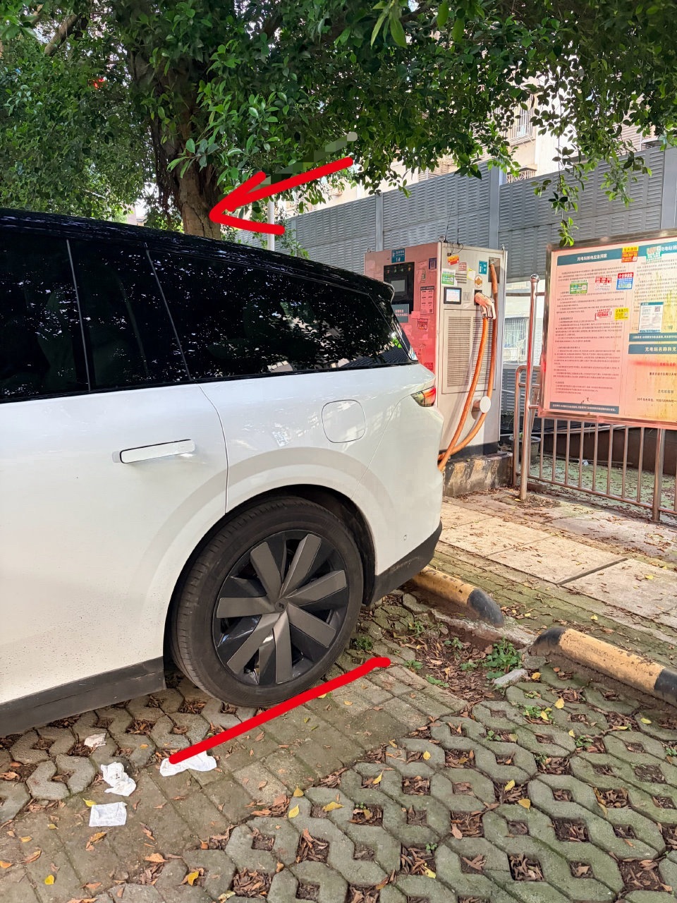 其实这里几个车位中间都有一根树(不是两个车位,大概三个或者四个),树干大概对着车位线,所以我的车右侧后面其实也有棵树,只是我当时不需要开尾门就挨着很近停了,当然最主要我是停在车位线内的,没有压线。