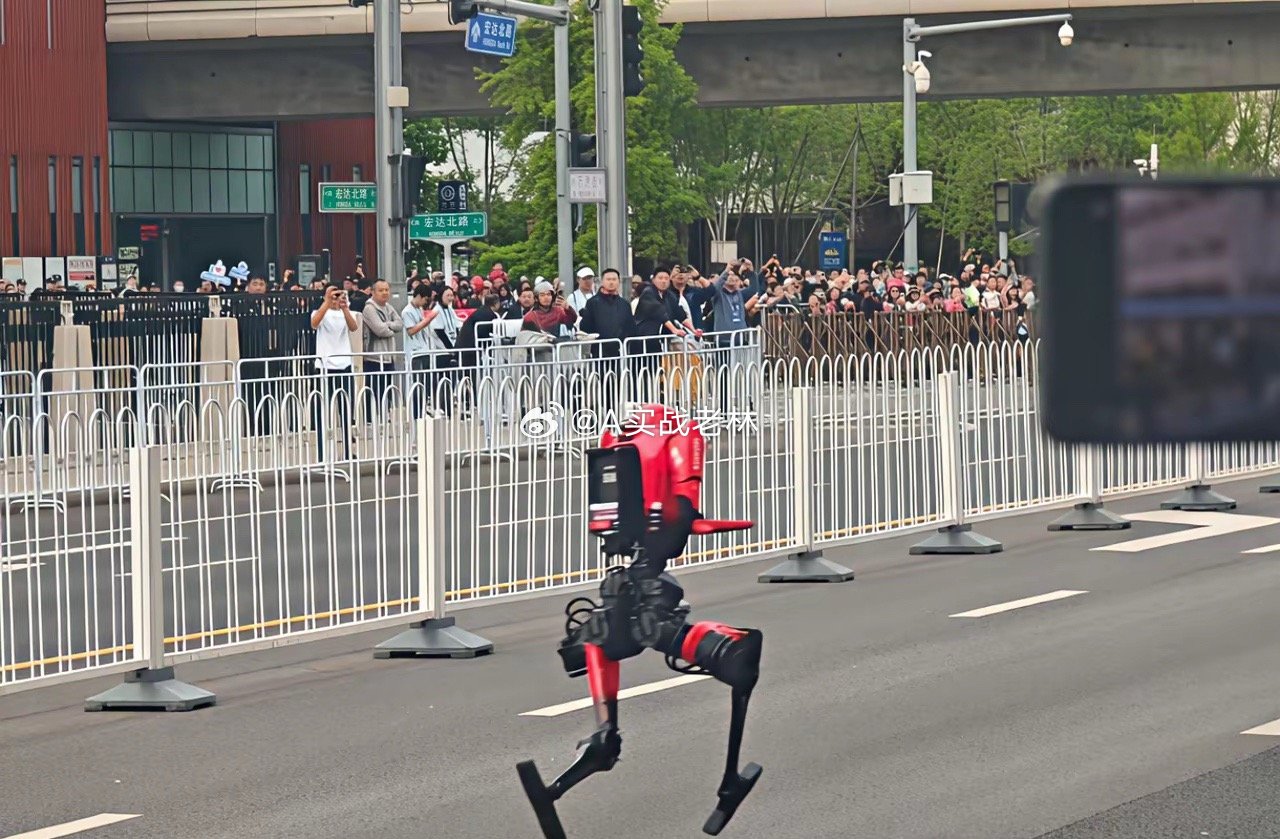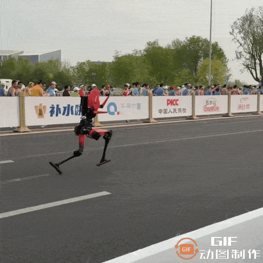 嗖的一下过去了……太快了。荣耀人形机器人真棒…...太紧张了,最后冲线时,摔倒了。担架组都上去了,好在机器人又重新恢复,跑了起来。虽然一路磕磕绊绊,也有摔倒。最后冲线的时间,人形机器人已经超越了人类半程马拉松的时间……前三个冲过线的都是荣耀机器人……不过,荣耀机器人都是遥操的,也就是用手柄操作的。