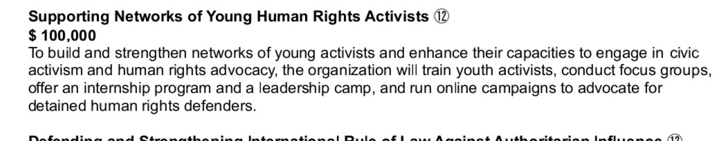 ² 这个组织专业做颜革的,会提前许多年发现、培养“青年活动人士”。比如图2:一年有10万美元,用于培训中国的“青年人权活动人士”,给他们安排实习、进入“领导力训练营”、建立活动小组,鼓励他们开展线上线下活动。划重点:这笔钱还用于“在线声援”被拘留的青年。
