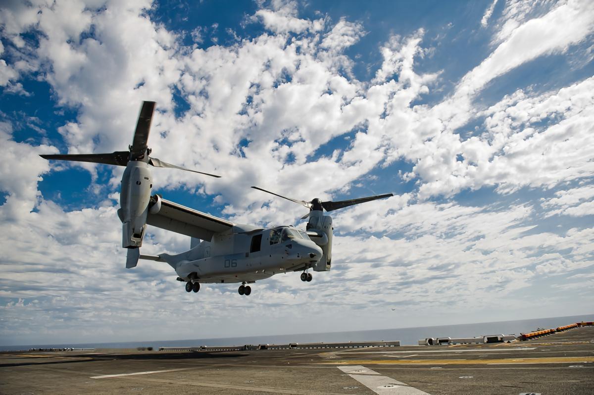 MV-22是V-22“鱼鹰”(Osprey)倾转旋翼机的美国海军陆战队专用型,由美国贝尔直升机公司和波音公司联合研制,截至2015年约有350架在美国海军陆战队服役。