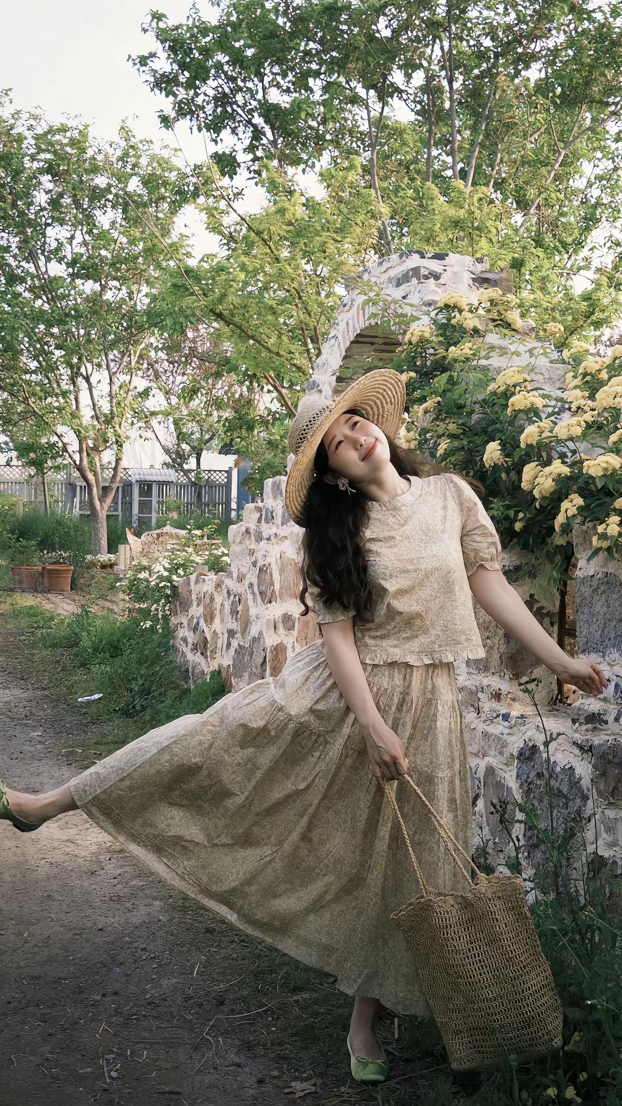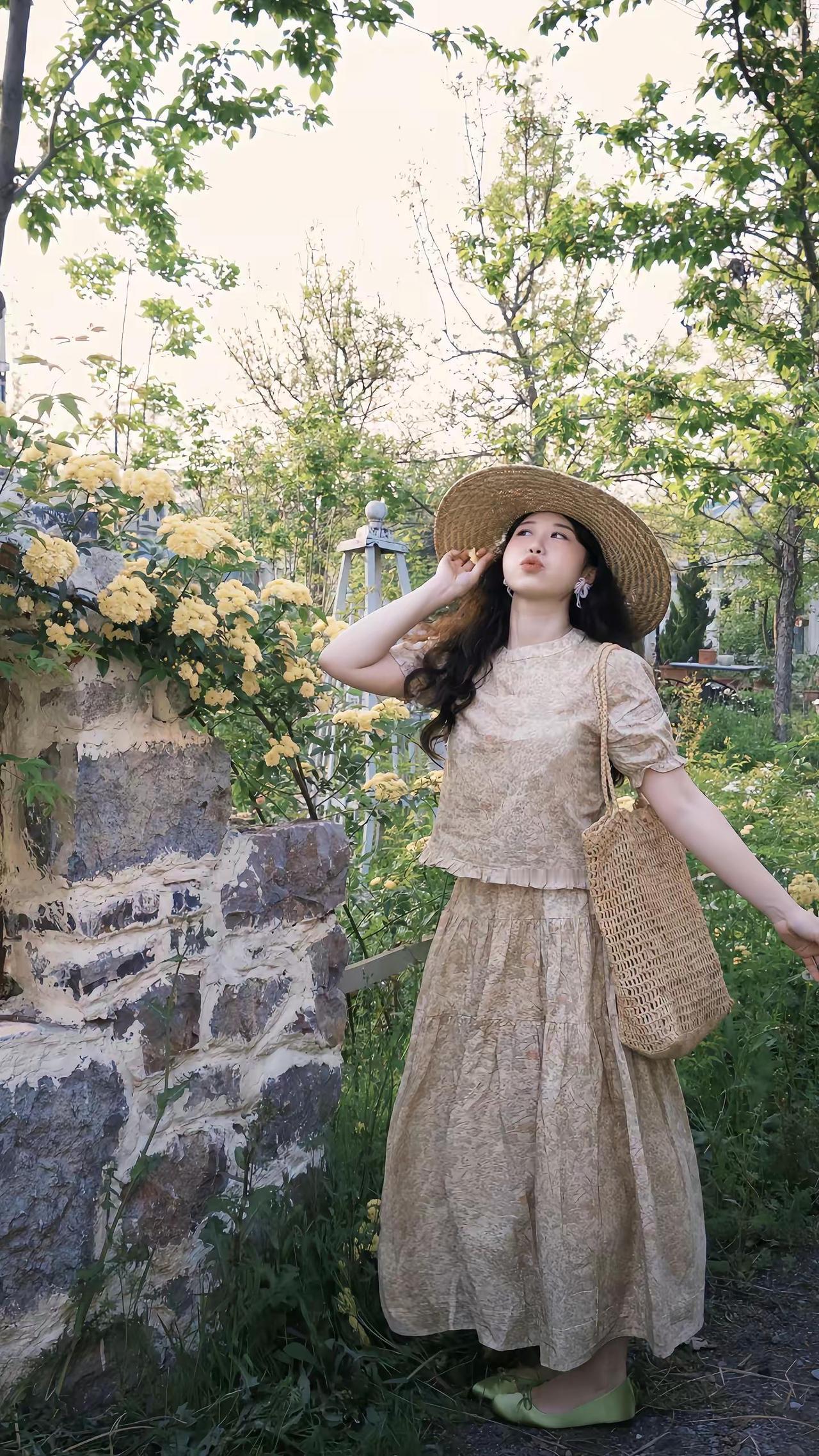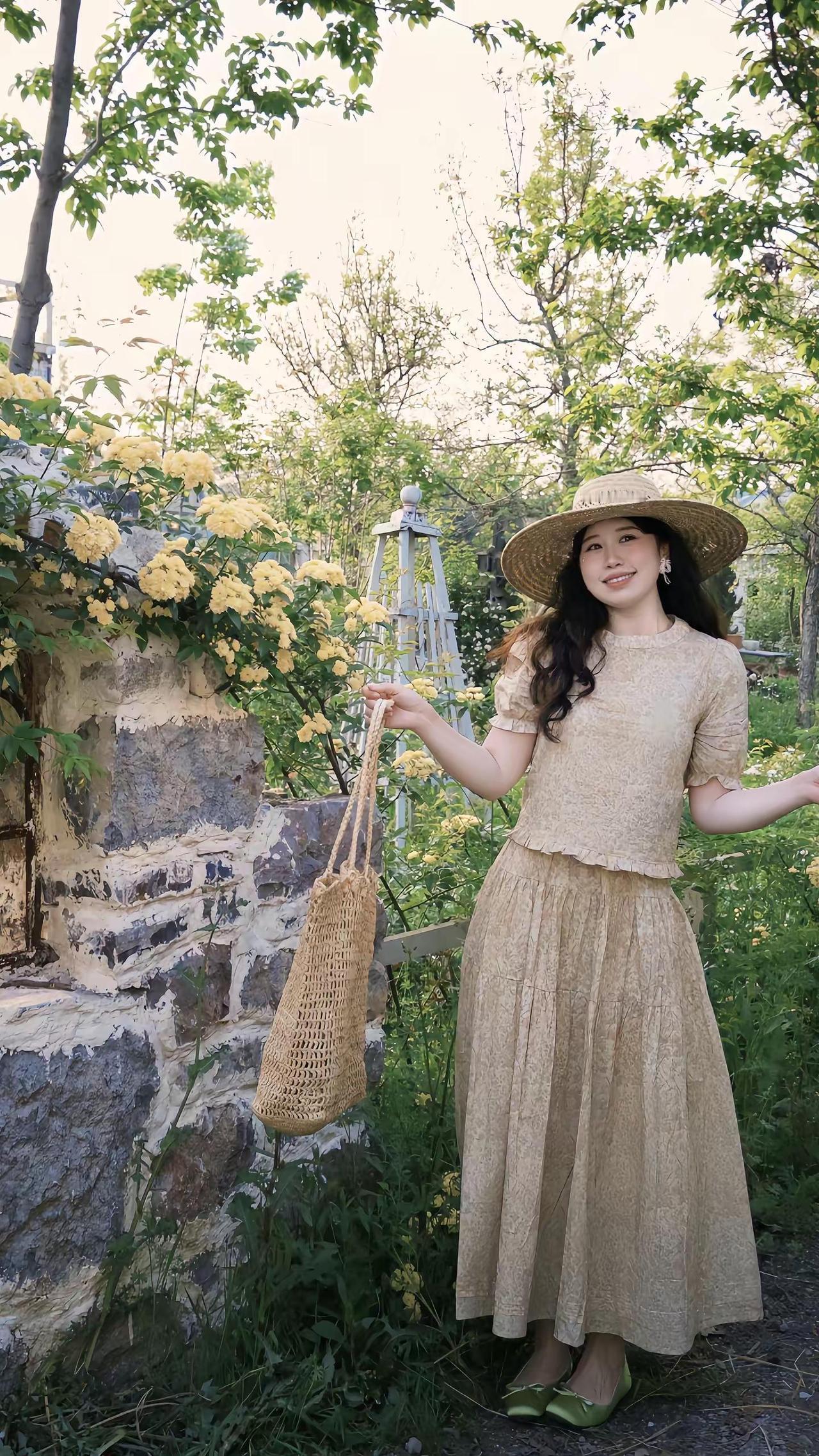掉进春日南法花园🌾🪻🍃复古黄色碎花裙 草帽与碎花裙