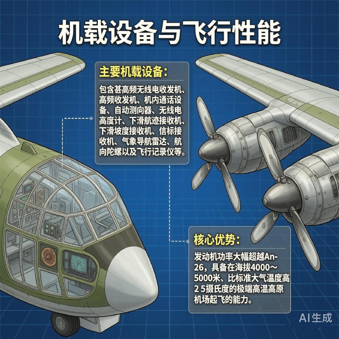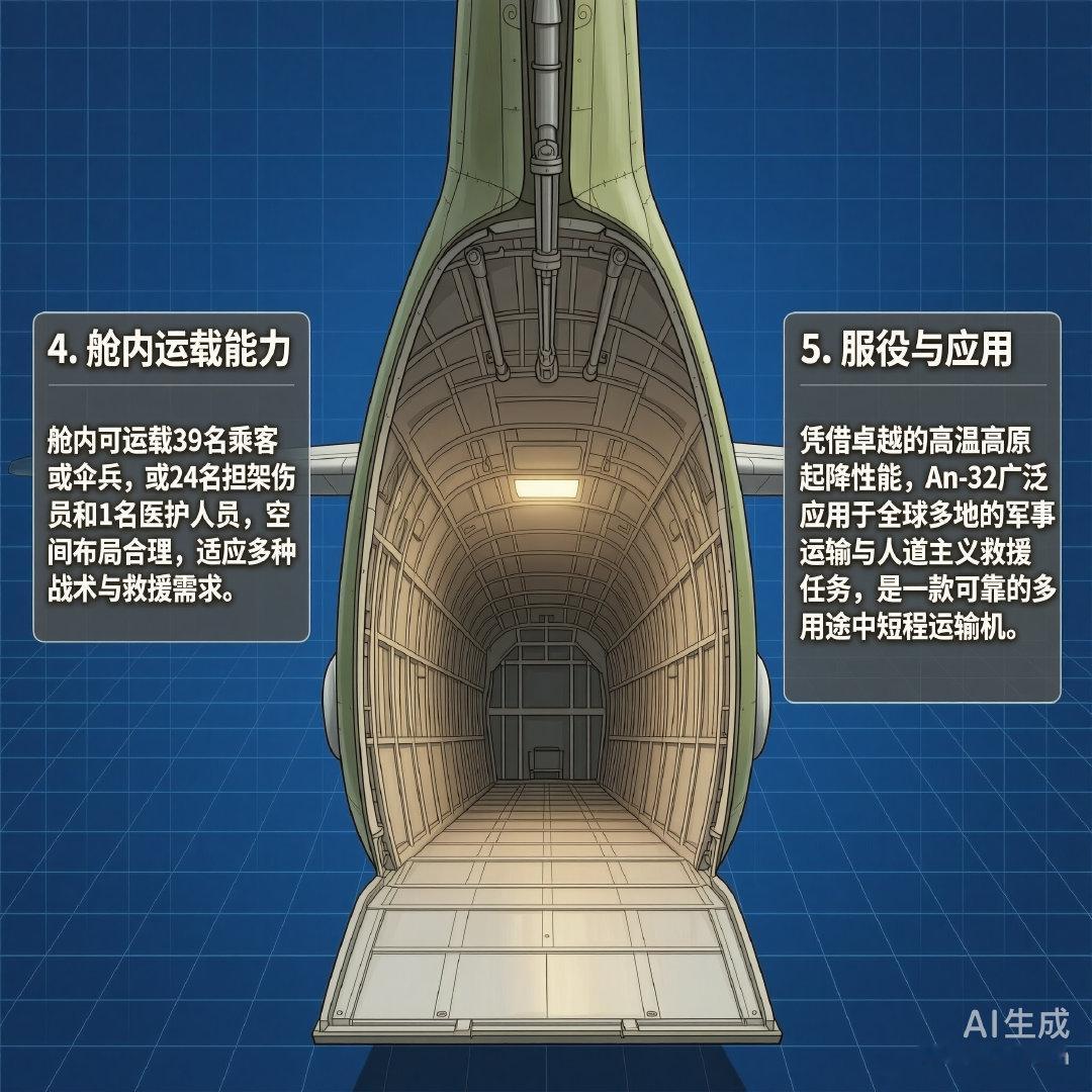 An-32运输机主要用于高温、高原机场,舱内可运载39名乘客或伞兵,或24名担架伤员和1名医护人员。An-32的发动机功率比An-26的要大,能在海拔4000~5000米比标准大气温度高25摄氏度的机场上起飞。