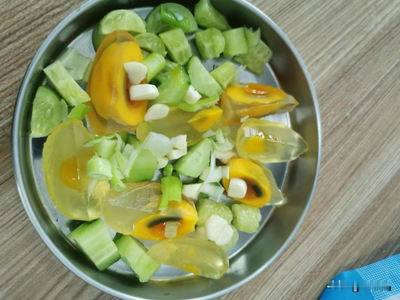 93岁的妈妈的午餐是的黄瓜松花蛋、卤鸡爪和鸡翅、炖豆角土豆。(见图4.5.6)