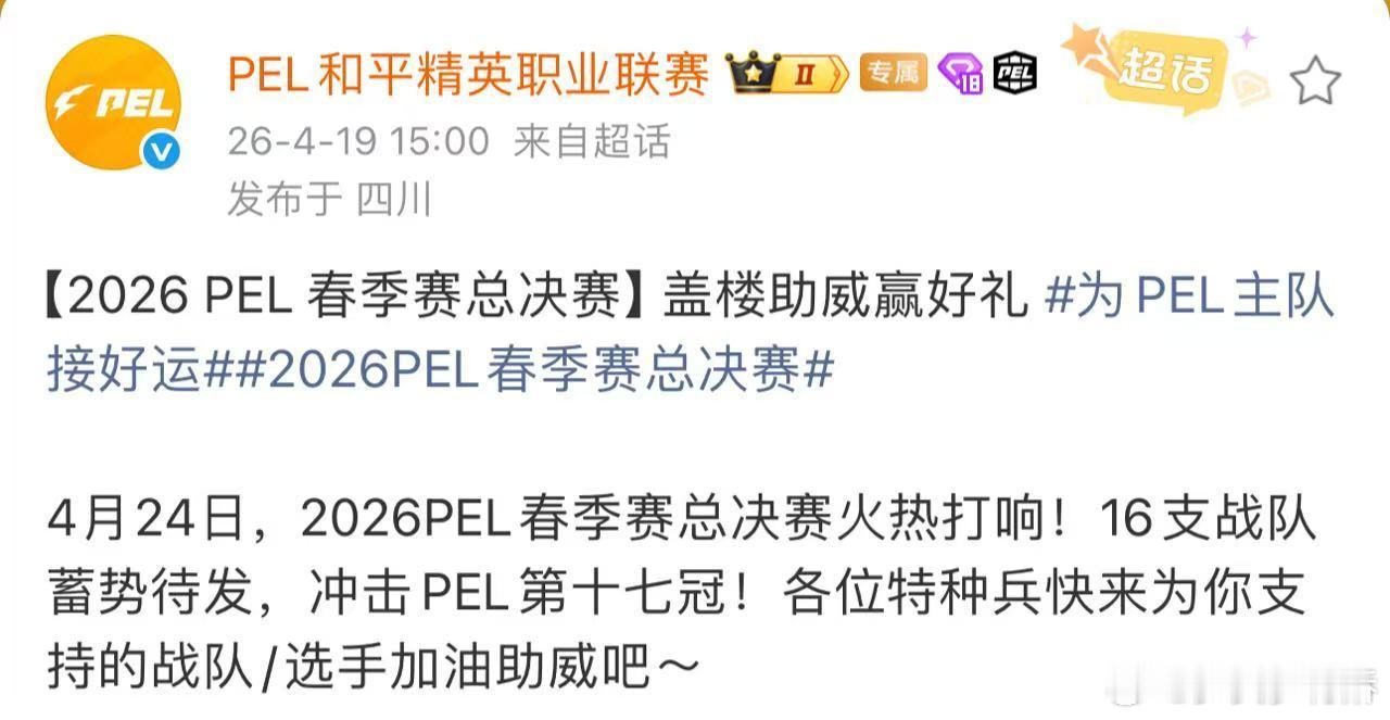 PEL盖楼活动开启,全员集结为主队应援!愿每局天命圈加持,状态拉满,一路高歌登顶巅峰!