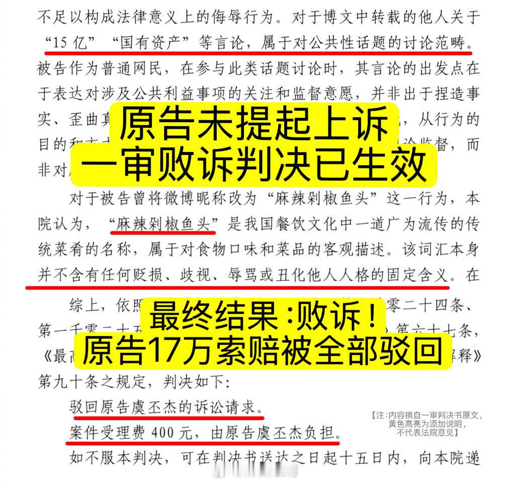 虞书欣父亲虞丕杰起诉网友索赔17万该网友发帖,说虞书欣爸爸败诉了,案件受理费400也由虞书欣的爸爸承担
