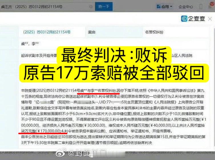 虞书欣父亲虞丕杰起诉网友索赔17万该网友发帖,说虞书欣爸爸败诉了,案件受理费40