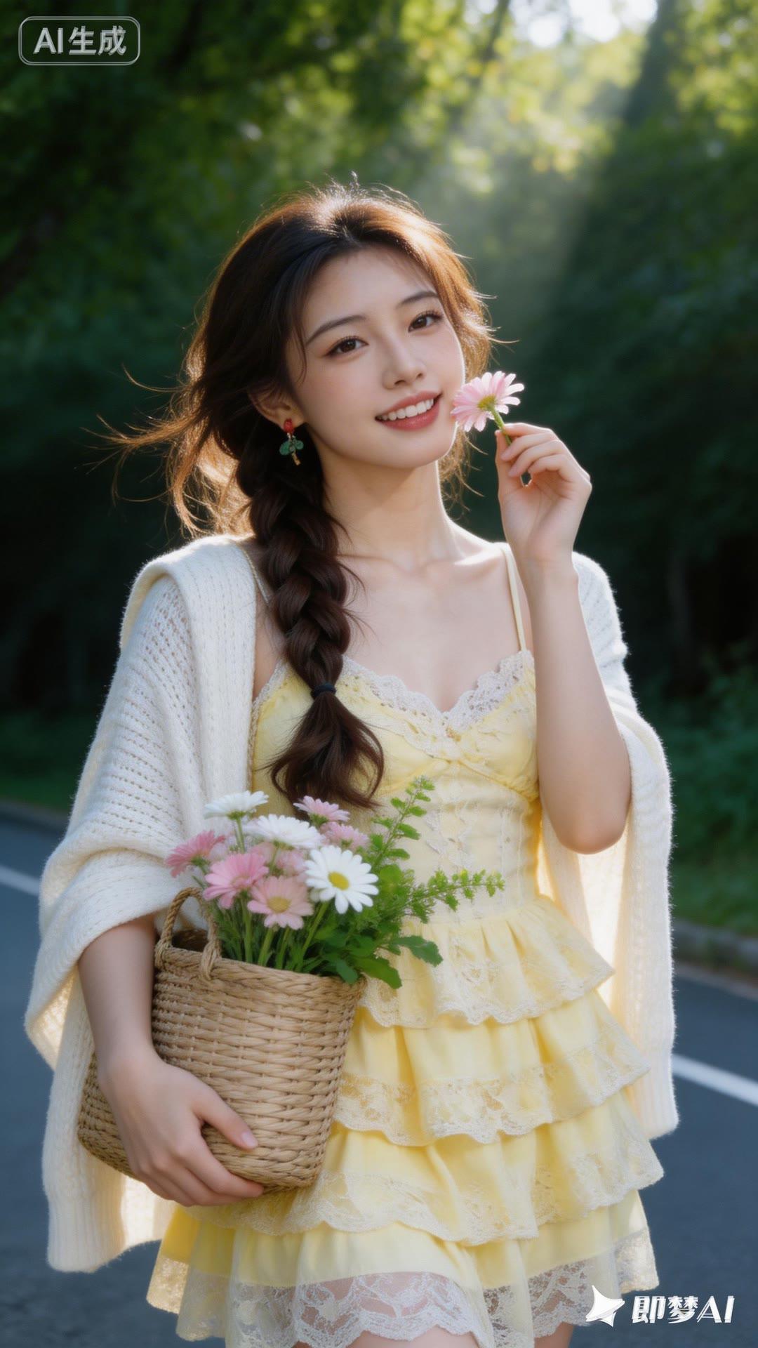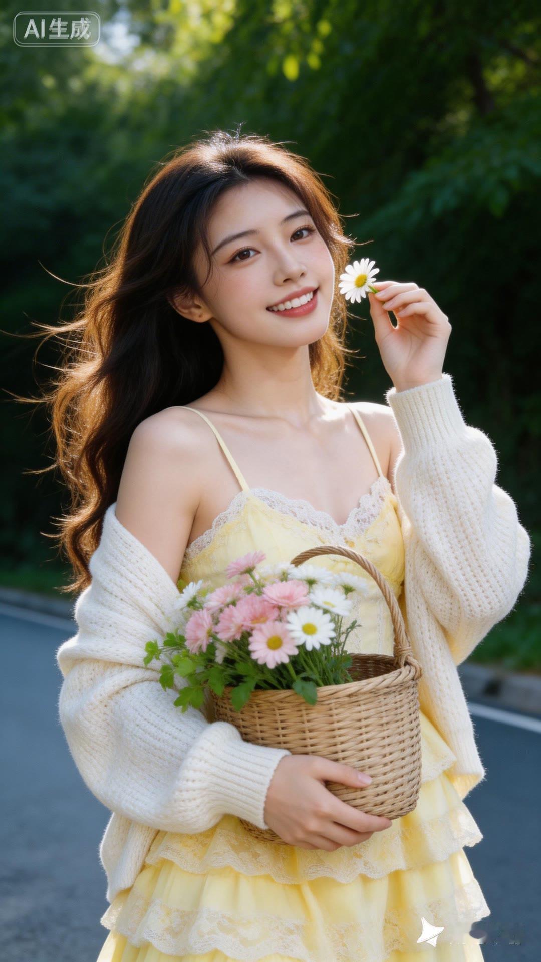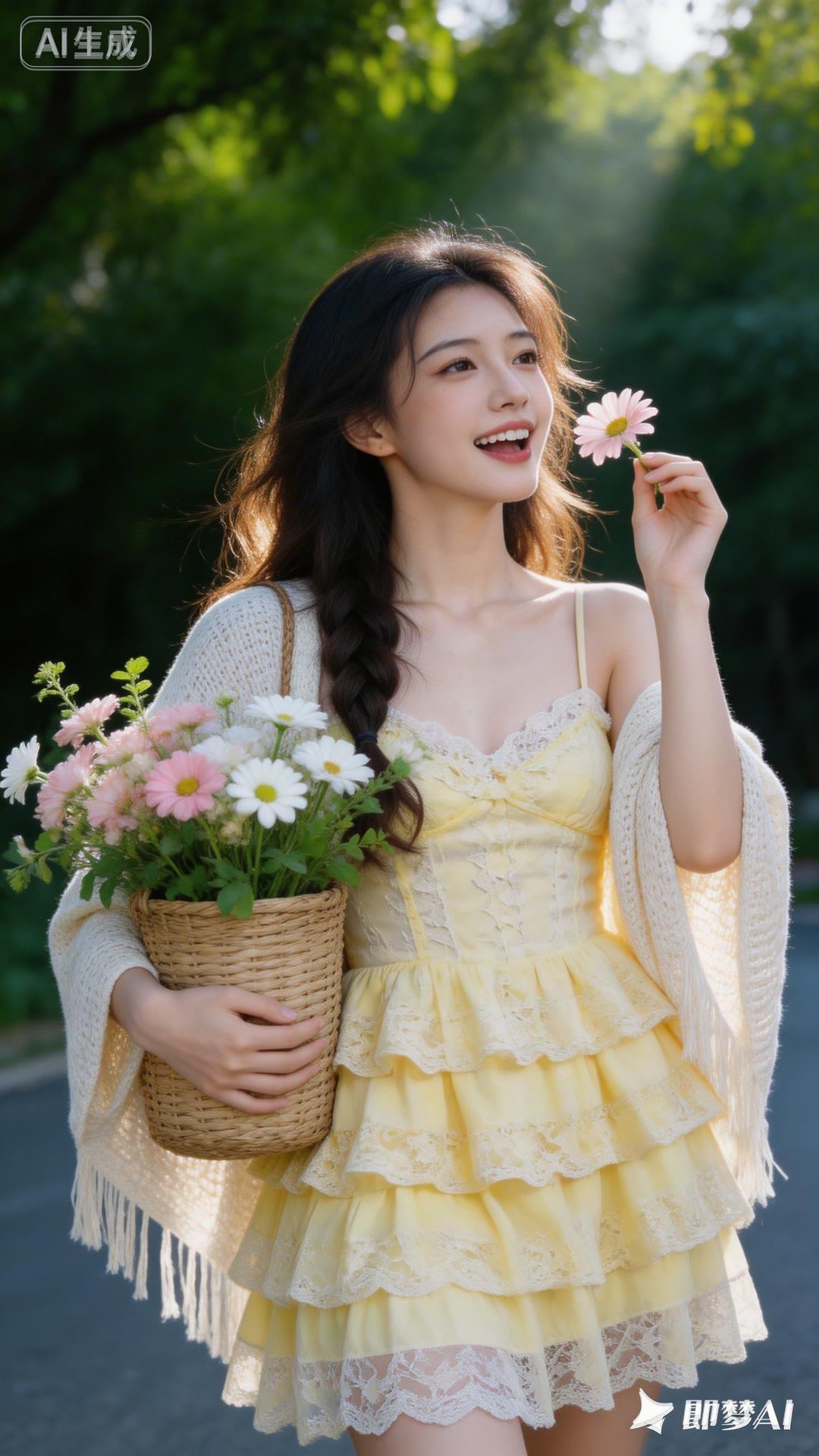 夏日甜美穿搭,花篮手捧,阳光下的少女
