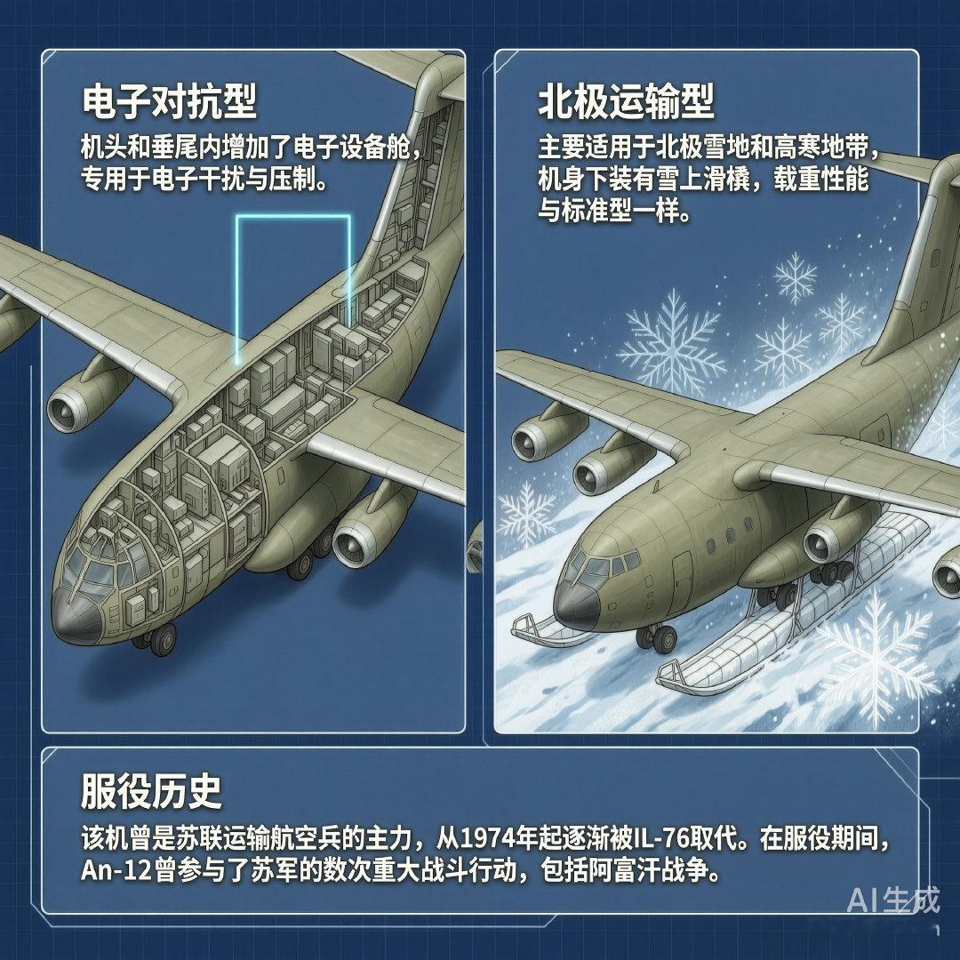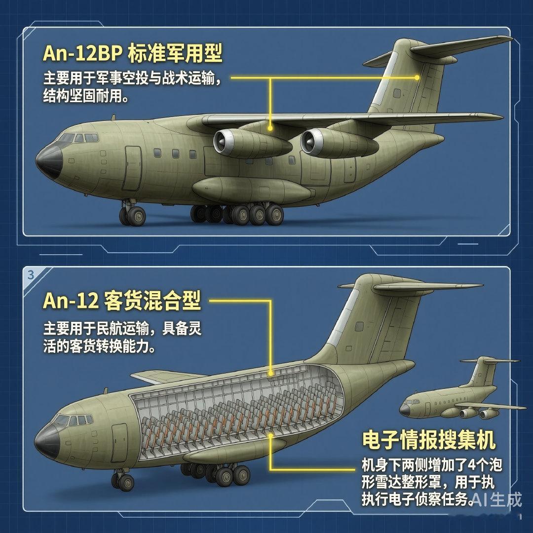 An-12有多种型别,其中An-12BP是标准军用型。An-12客货混合型主要用于民航运输。An-12电子情报搜集机,机身下两侧增加了4个泡形雷达整流罩。An-12电子对抗型的机头和垂尾内增加了电子设备舱。An-12北极运输型主要适用于北极雪地和高寒地带,机身下装有雪上滑橇,载重性能与标准型一样。
