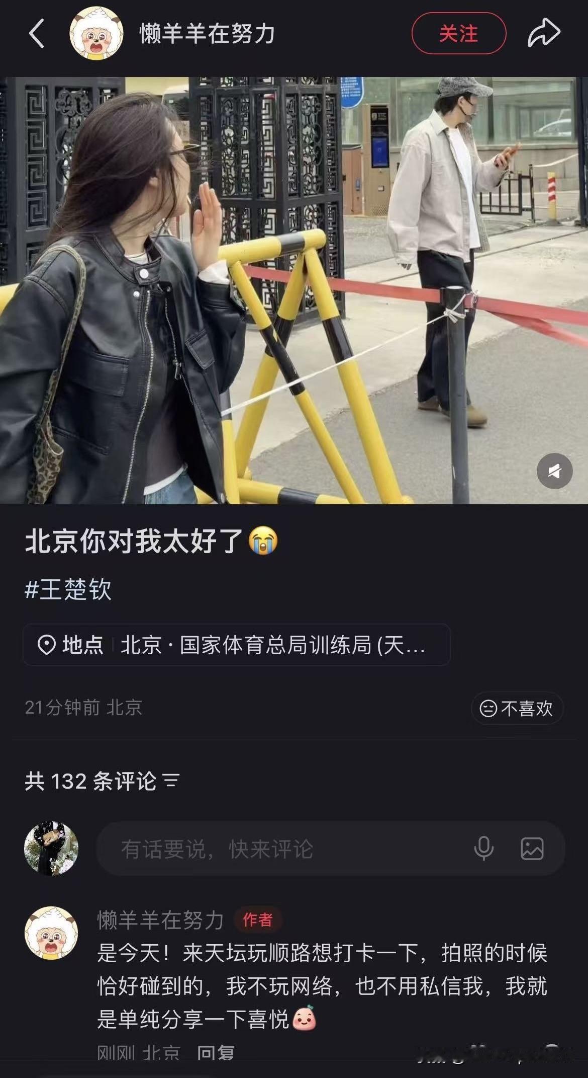 今天上午就有人发在北京看到王楚钦,
