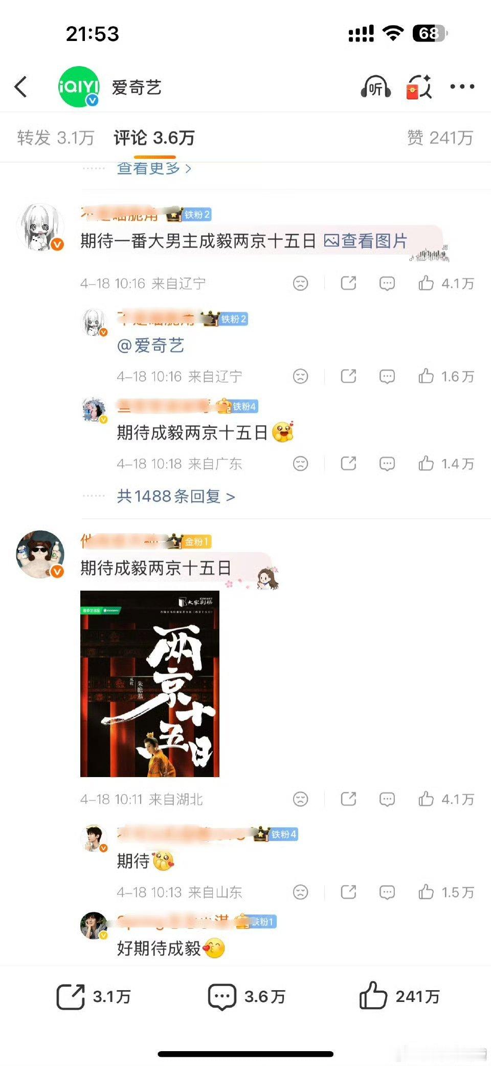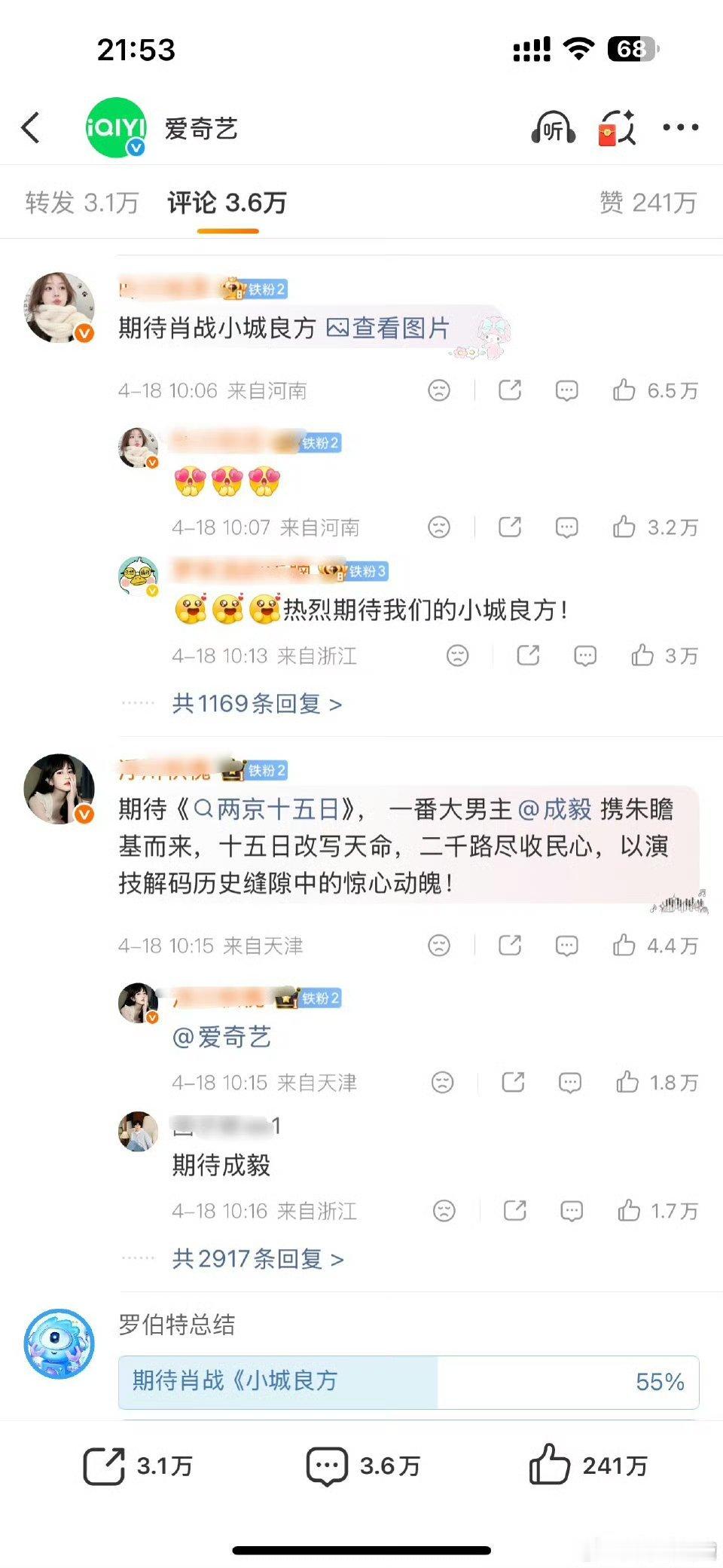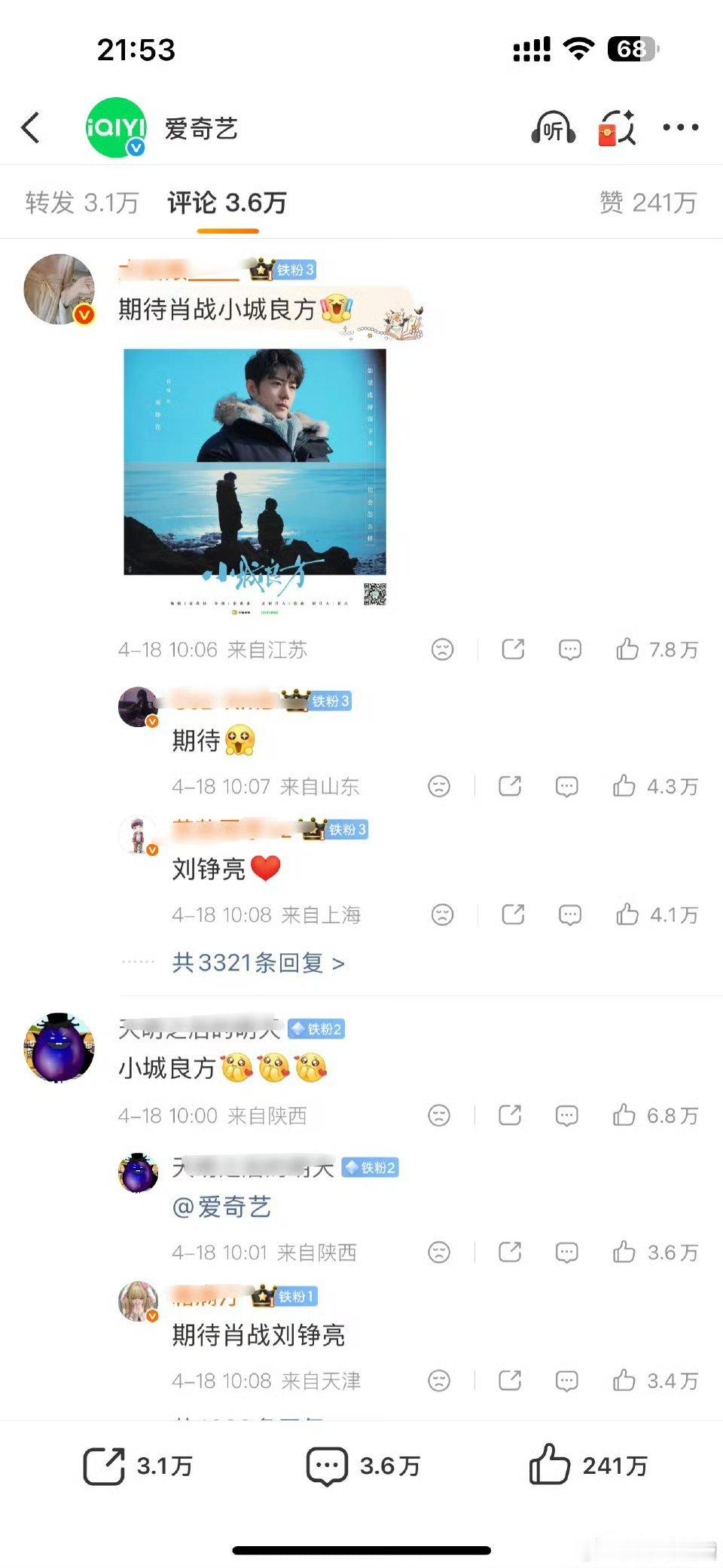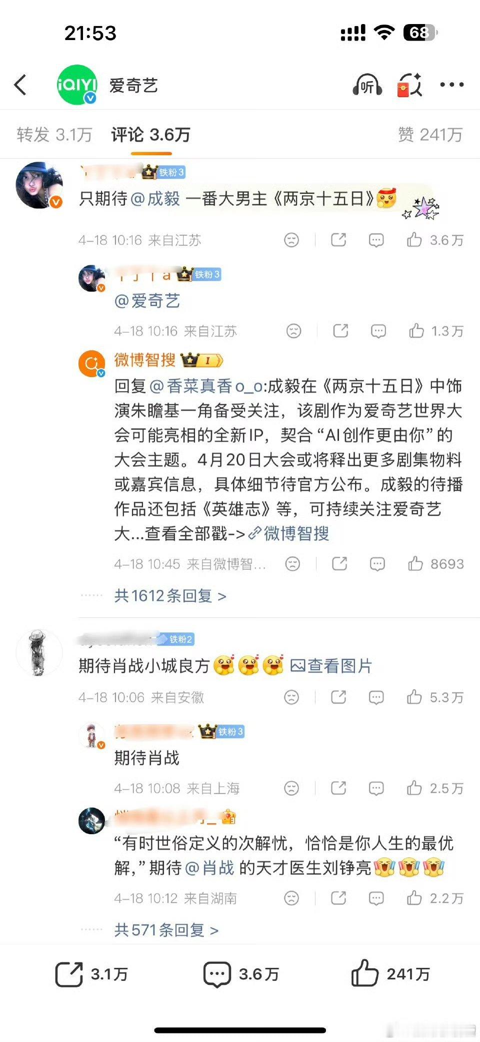 肖战和成毅谁活粉更多?俩人粉丝把爱奇艺点到两百多万👍了,目前前排都是肖战粉丝