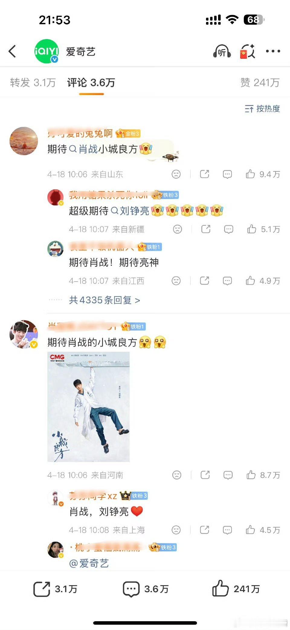 肖战和成毅谁活粉更多?俩人粉丝把爱奇艺点到两百多万👍了,目前前排都是肖战粉丝 …