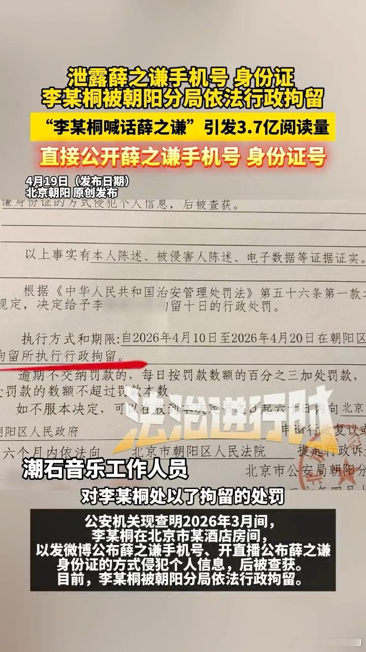 李雨桐被行拘据北京卫视《法治进行时》消息,李雨桐此前公布薛之谦个人信息,导致薛之谦及其家人遭遇开盒,人身安全遭遇极大威胁,公安机关因此对李雨桐做出拘留处罚。