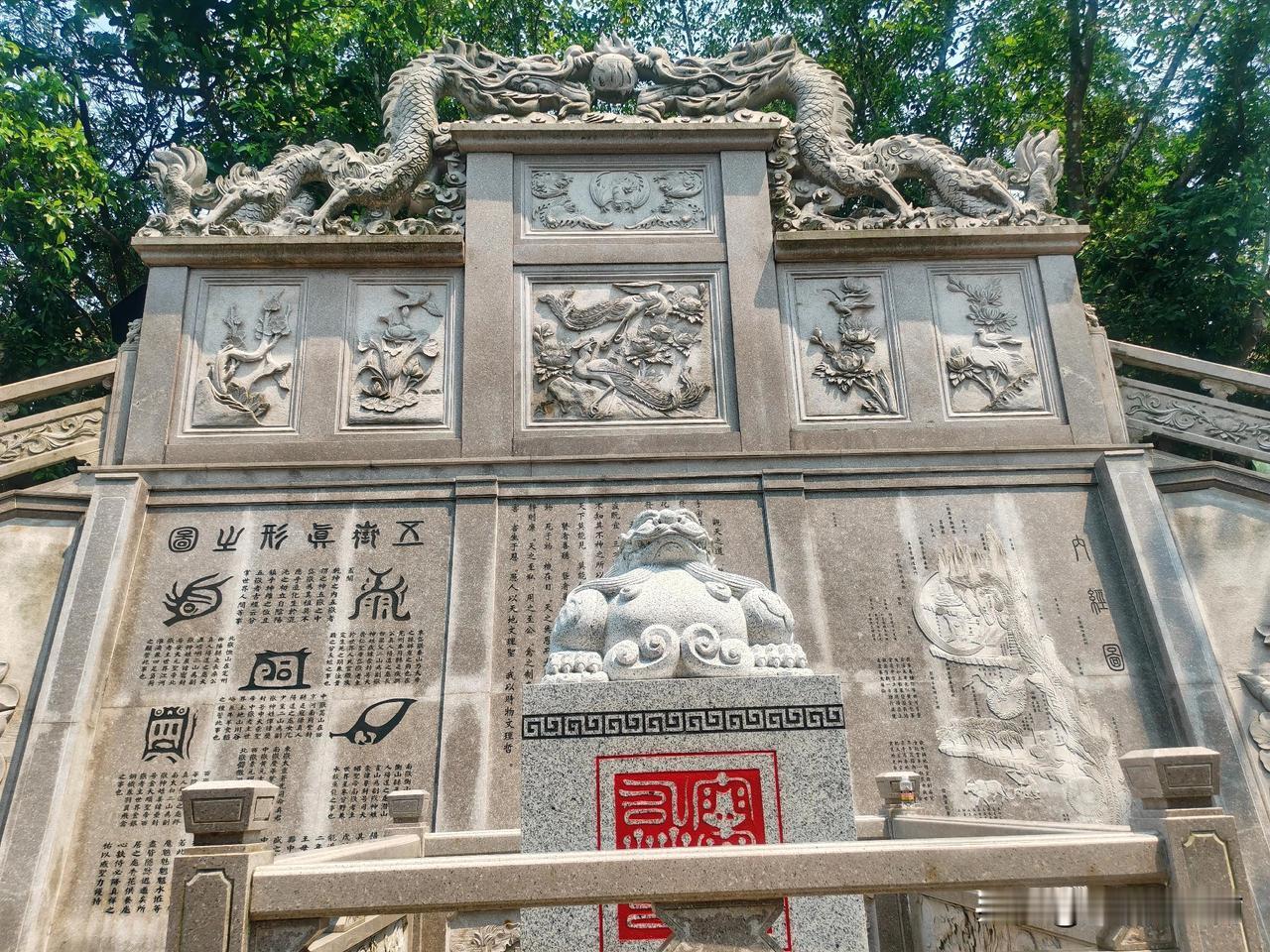 到文笔峰,首先映入眼帘的就是大罗圣境的四柱牌坊,这也是玉蟾宫的山门,过了检票处,南宗宗坛四个大字石牌立在眼前,这里便是中轴线,石阶一路向上,映入眼帘的又是一个大牌坊,上书琼阆仠苑,穿过牌坊到一平台,左右两侧分别是财神殿,药王殿。