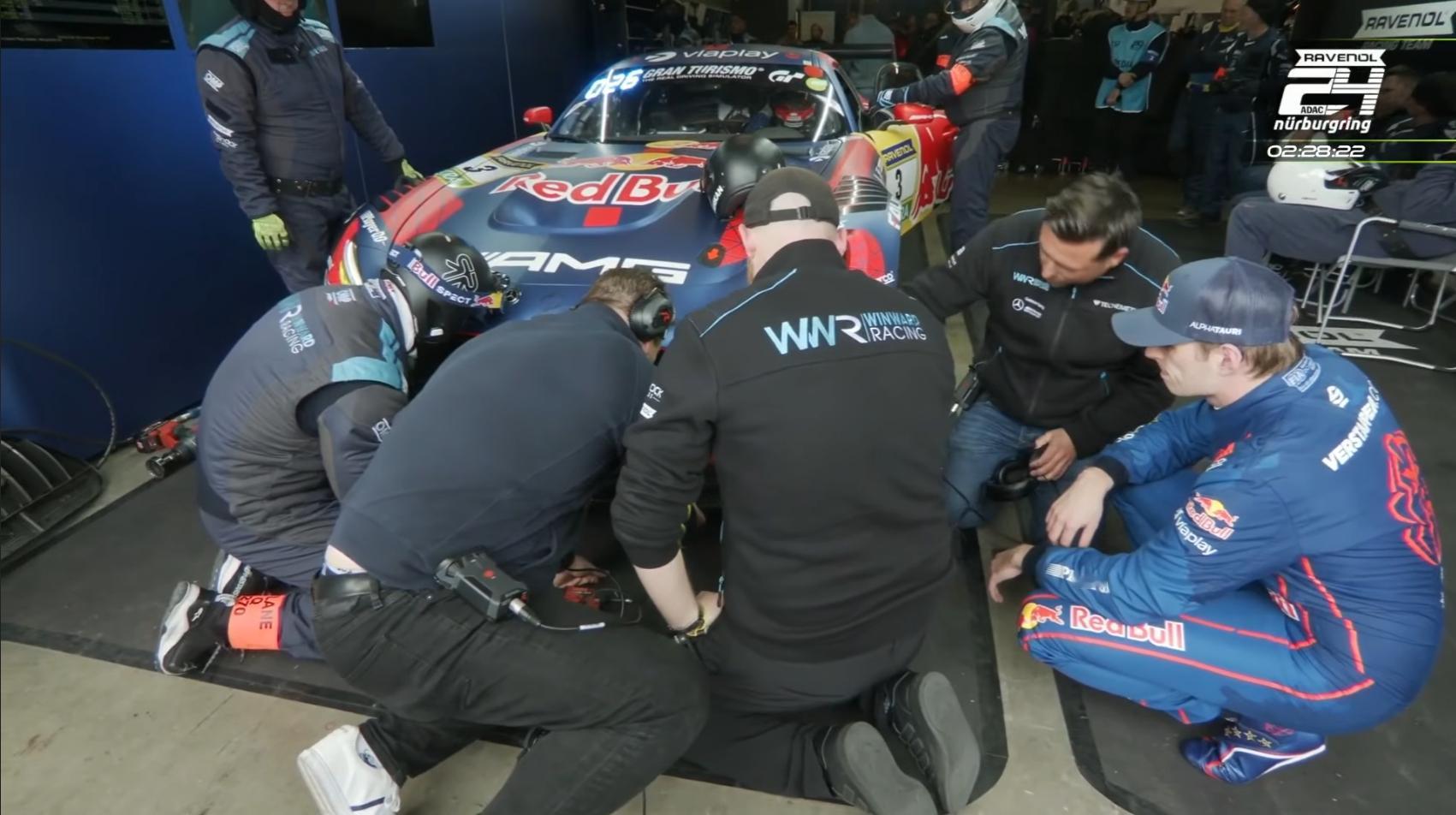 维斯塔潘返回维修区之后,虽然奥尔坐进了赛车,但3号梅赛德斯-AMG GT3被推入车库抢修