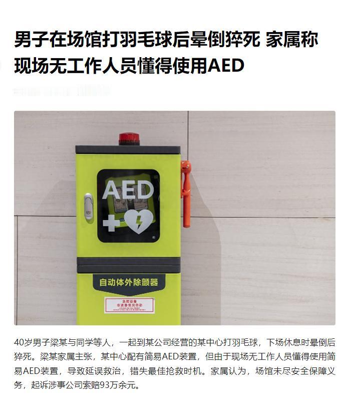 事后,梁某的家属认为球馆虽然配备了AED,但抢救时没有使用,耽误了黄金抢救时间,所以将球馆告上了法院,索赔93万元。
