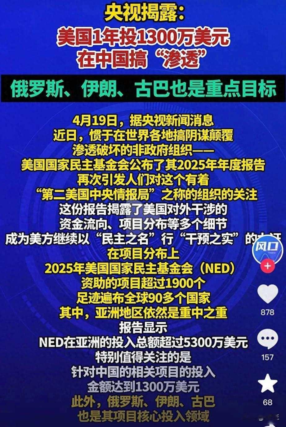 2026年4月19号,央视播了一条消息,说美国国家民主基金会在2025年的报告里提到,专门针对中国的项目就拨了1300万美元,这笔钱不是突然出现的,而是过去十年一直在持续投入的延续,报告里清楚列出了三个重点投钱的方向,包括“青年赋权”“独立媒体”和“分裂势力扶持”,这个消息一公开,反而让很多人看懂了,中国这些年防渗透、稳根基的措施,确实不是白忙活的。