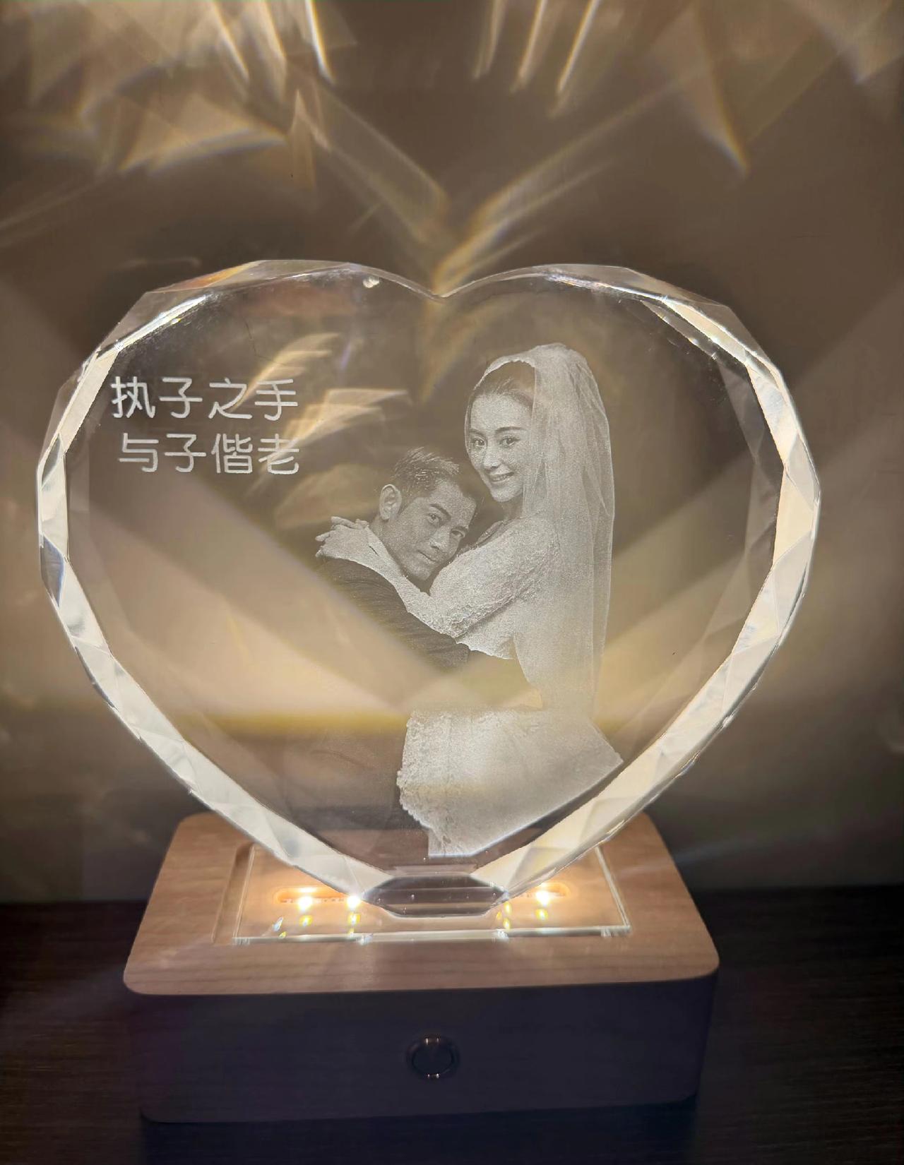 郭富城和方媛迎来了结婚九周年纪念日,夫妻俩好好庆祝了一番,没想到方媛直接穿睡衣出镜,晒着老公送的玫瑰花很是开心,更没想到的是,两人九周年的纪念礼物是一个看起来非常廉价的水晶灯,爱心形的灯上面印着夫妻俩的结婚照,写着“执子之手,与子偕老”字样,底座还会发光。