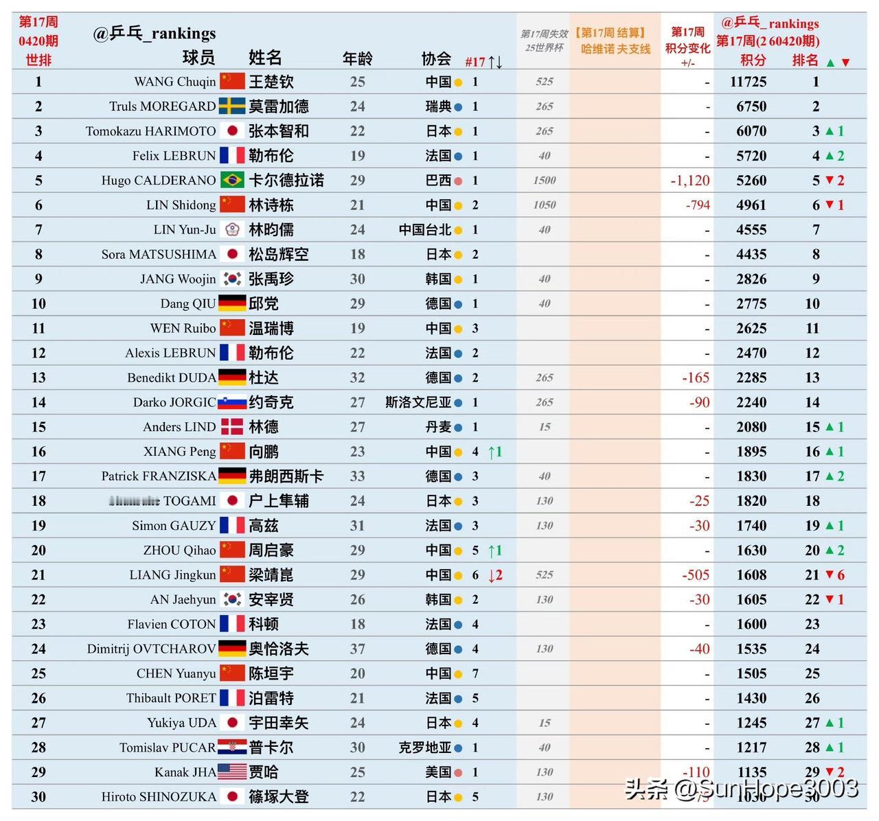 4.20日,国际乒联最新世界排名更新,梁靖崑,蒯曼变化较大。