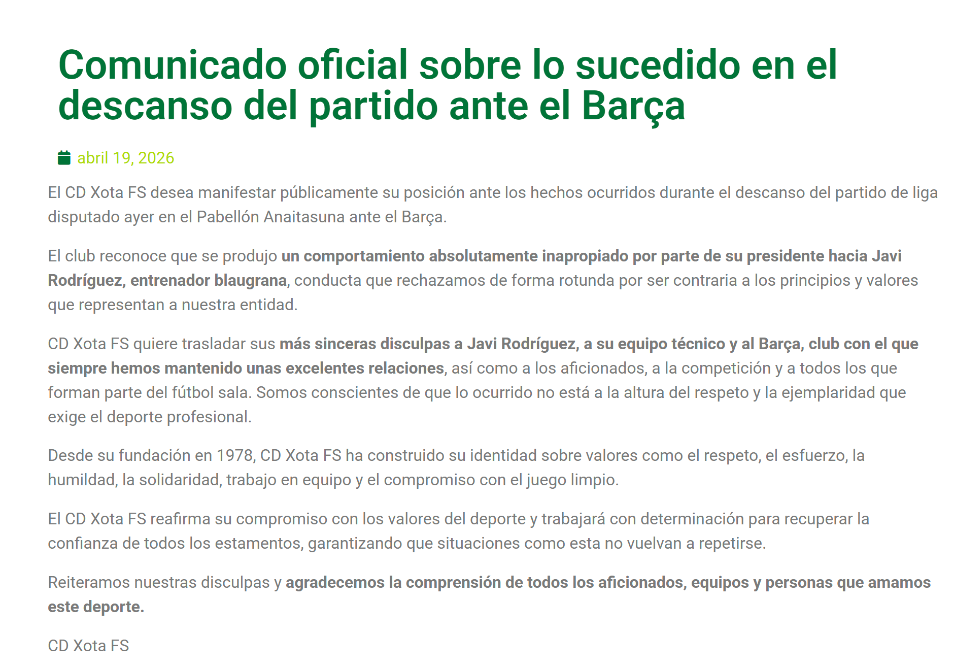 同时,俱乐部向罗德里格斯及其教练团队、巴塞罗那俱乐部表达了诚挚歉意,并向球迷、联赛以及所有五人制足球从业者致歉。声明中表示,俱乐部清楚此次事件未能体现职业体育应有的尊重与示范标准。