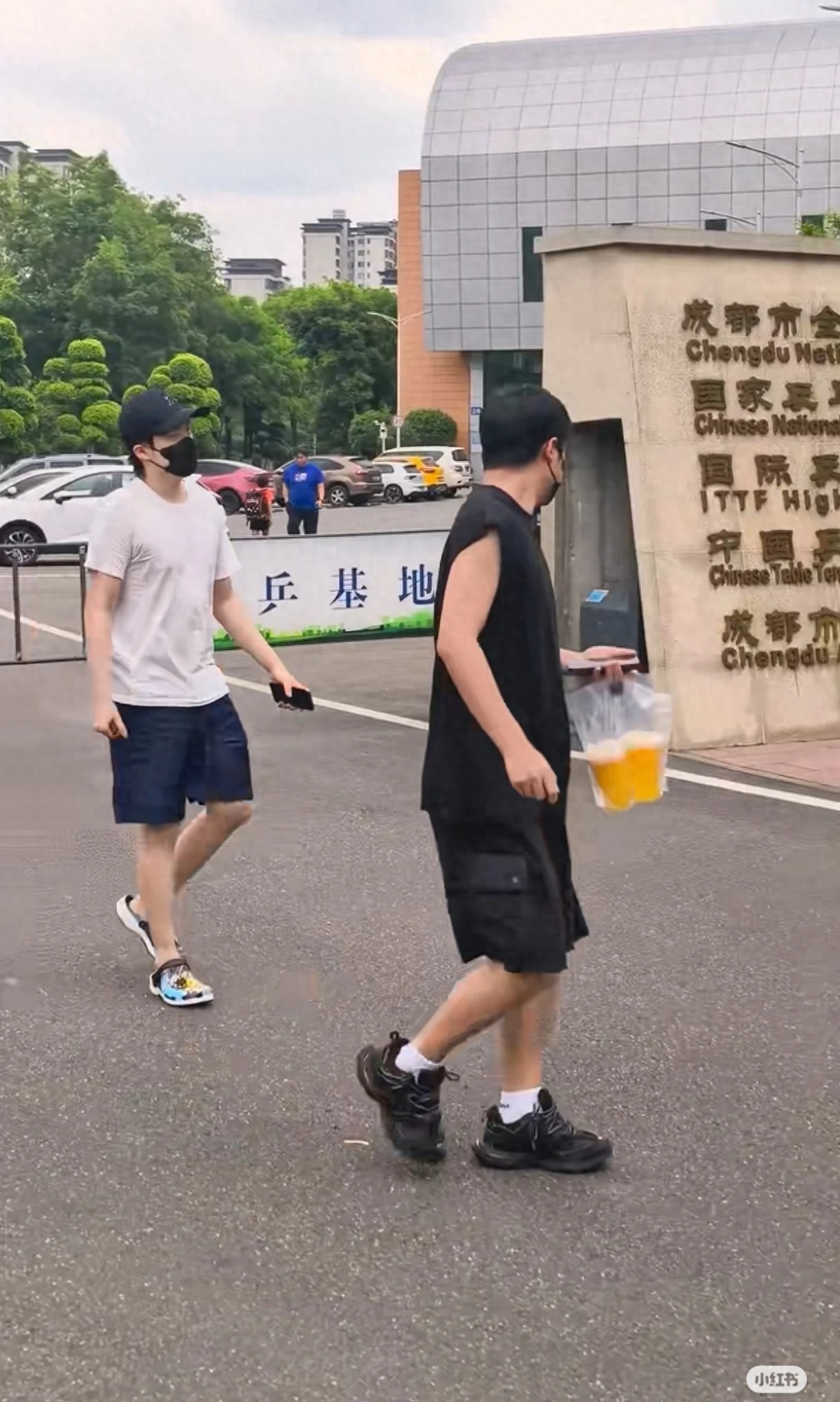 国乒集体放半天假,和队友曹巍一起打车外出。短袖+短裤+灰色洞洞鞋(鞋带还散着)。