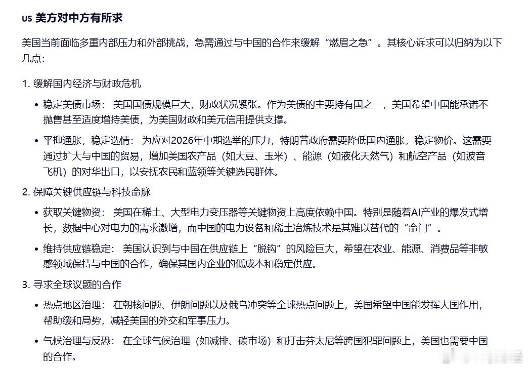 问:特朗普访华,老美对我们有所求的东西,和我们对老美有所求的东西。分别是什么:千问答:特朗普访华,中美双方都带着各自的核心诉求而来,这是一场典型的基于国家利益的博弈。简单来说,美方有求于中方之处更多、更急迫,而中方的诉求则更侧重于长远发展和核心利益。