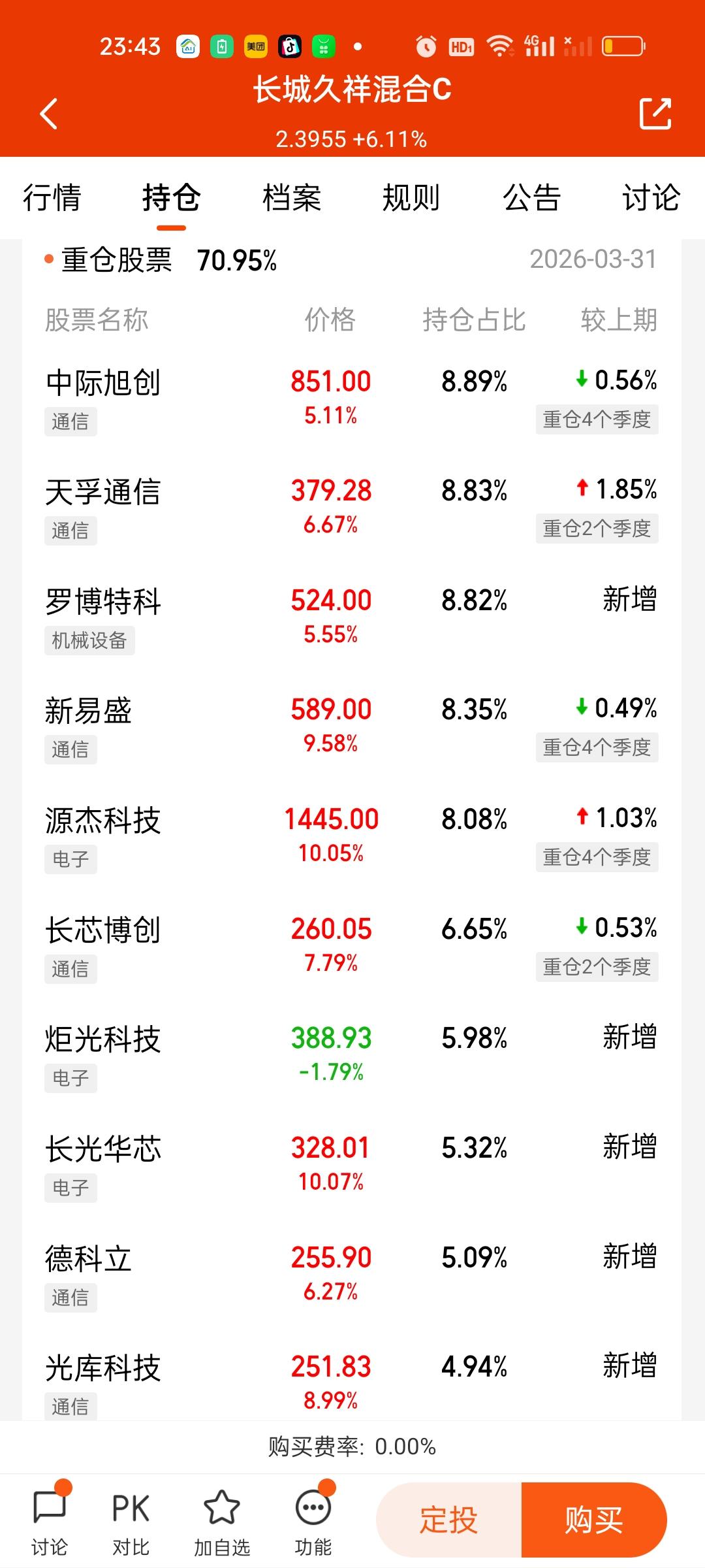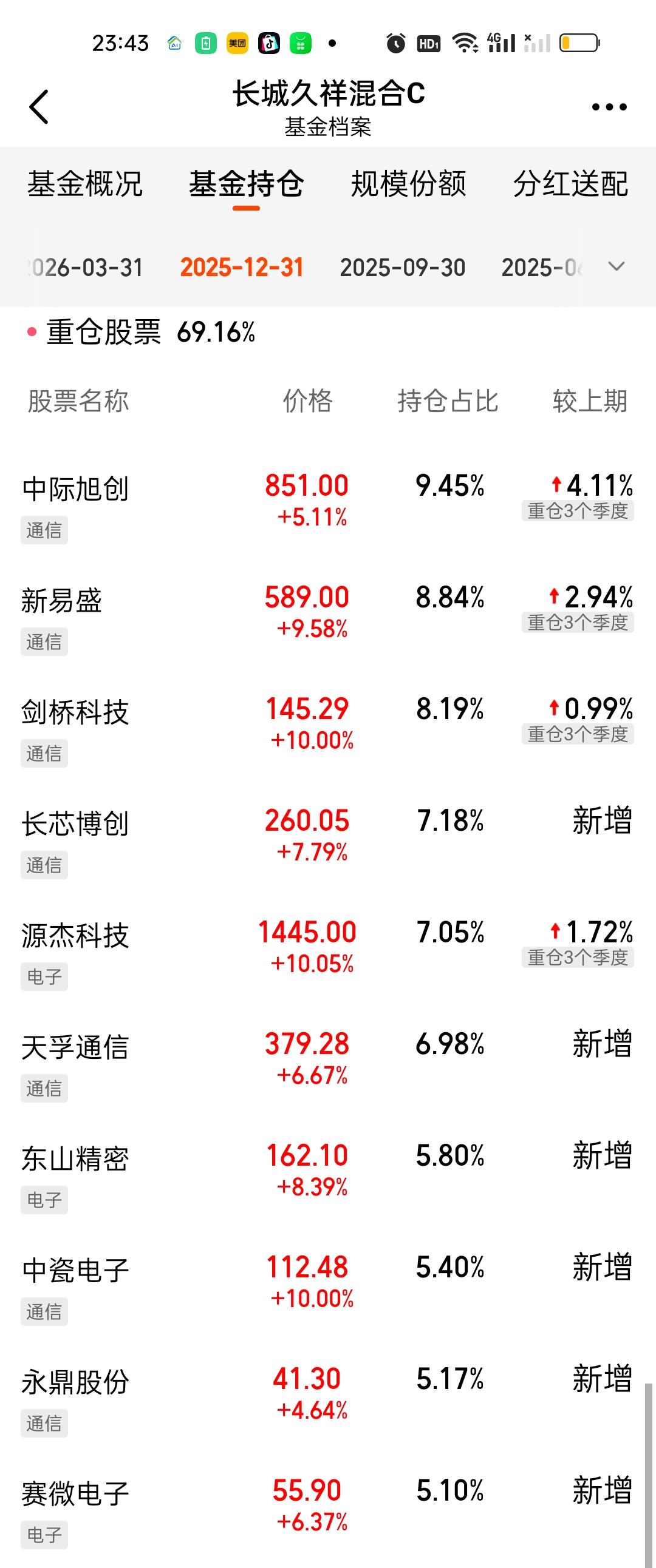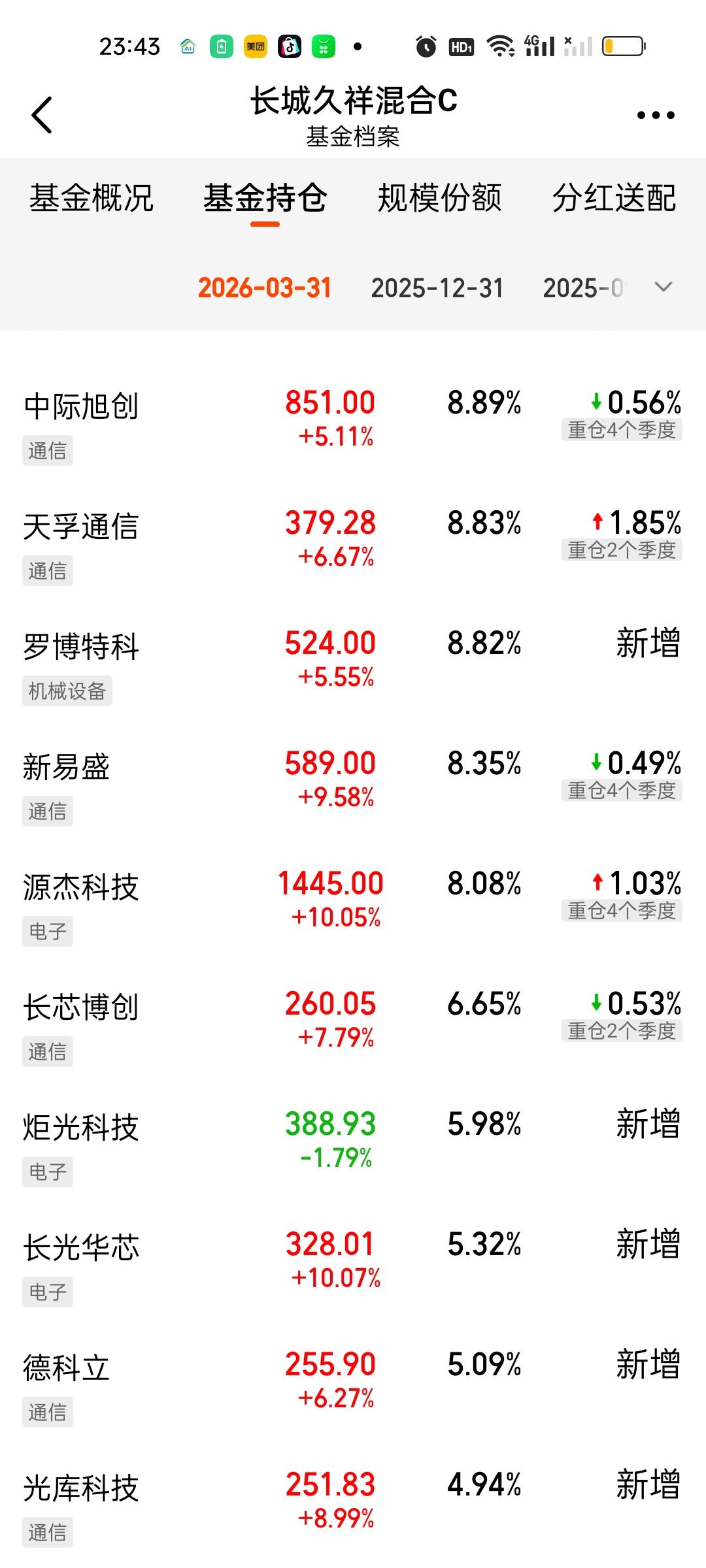 长城久祥最新持仓出来了,这次新增了5只个股,罗博特科,炬光科技,长光华芯,德科立,光库科技。舍弃了剑桥科技,东山精密,中瓷电子,永鼎股份,赛微电子。前十大重仓股占比也从69.16%提升到了70.95%。