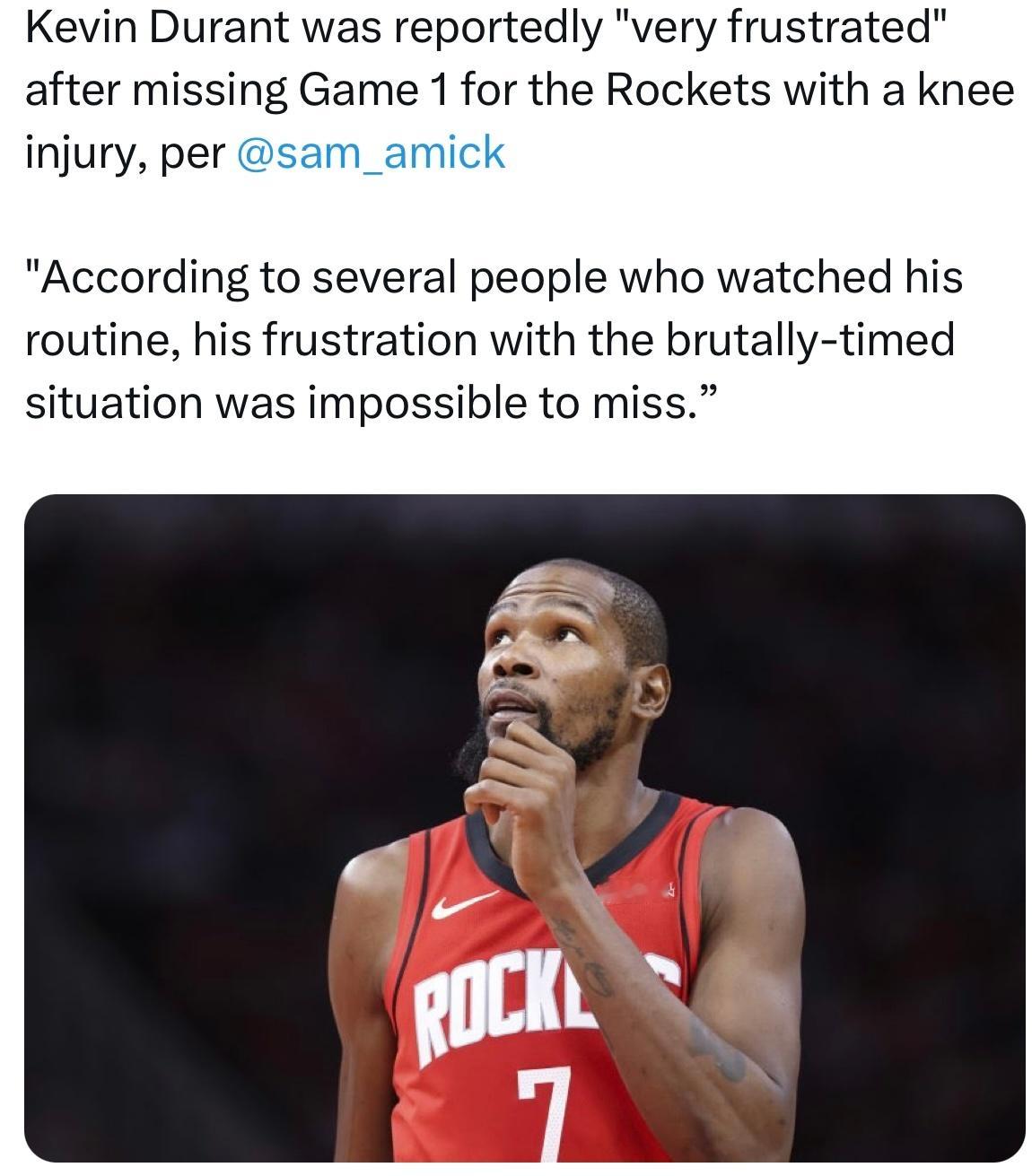 据记者Sam Amick报道,杜兰特因膝伤无缘火箭季后赛首战后,据称感到“非常沮丧”。