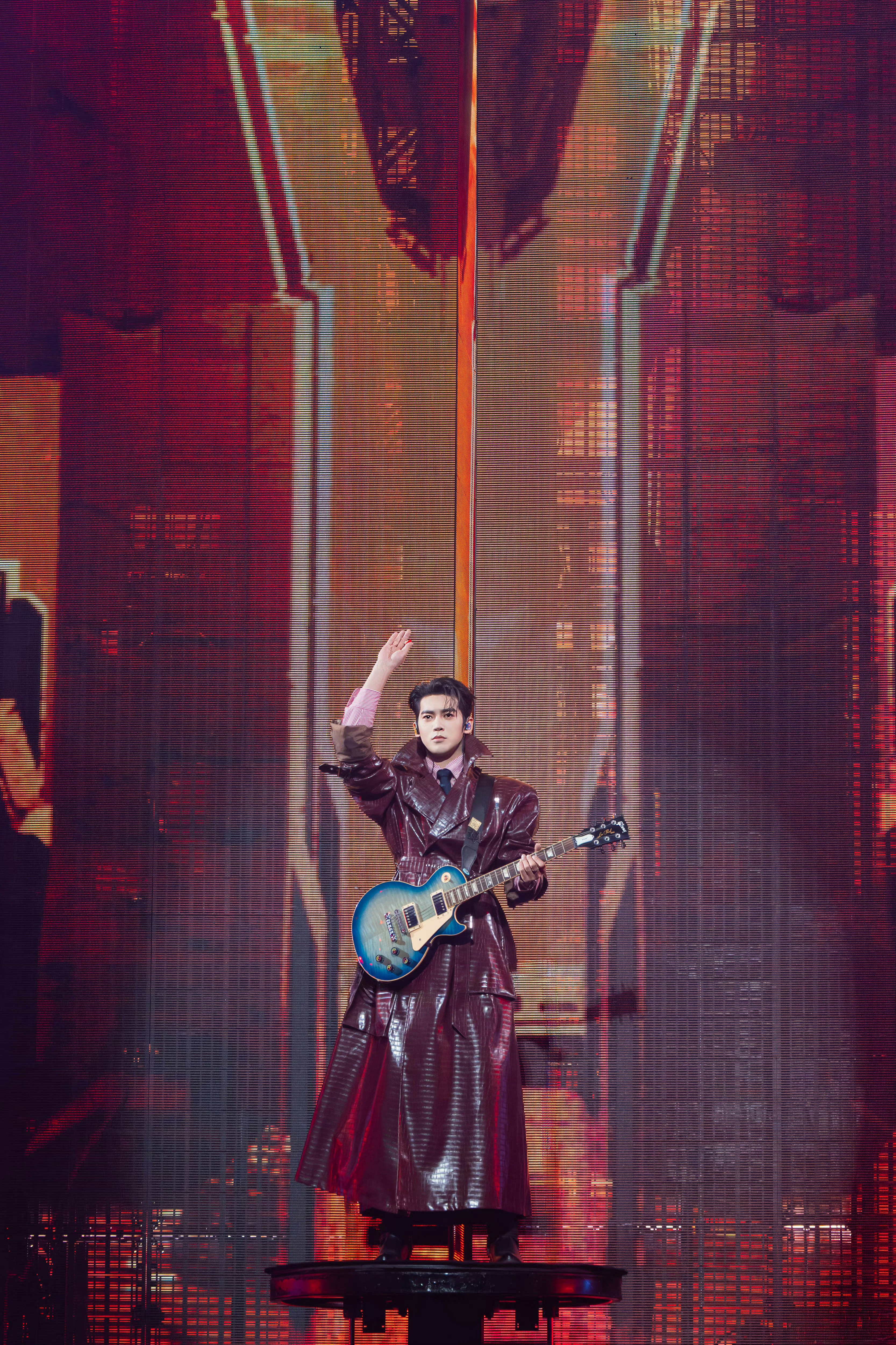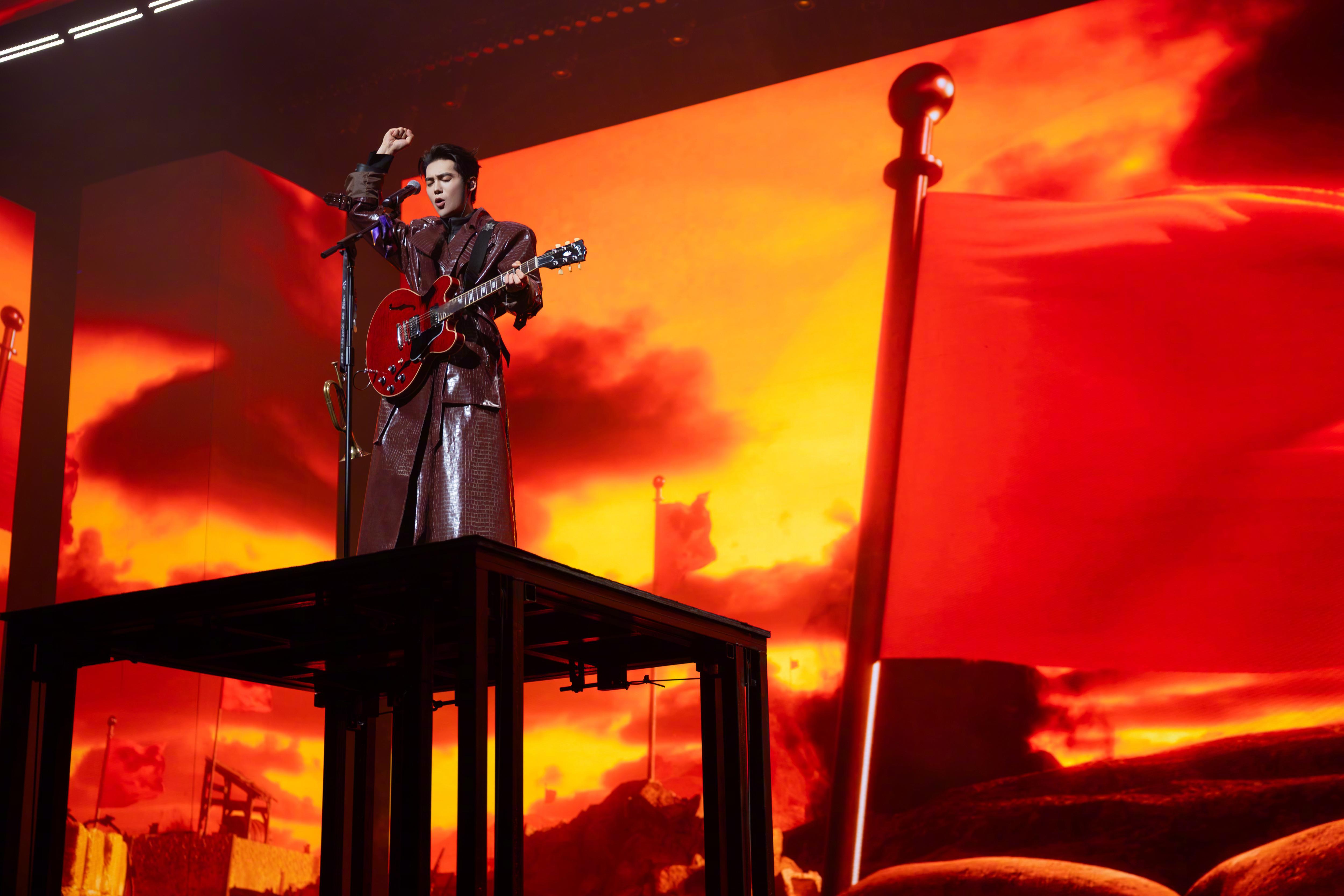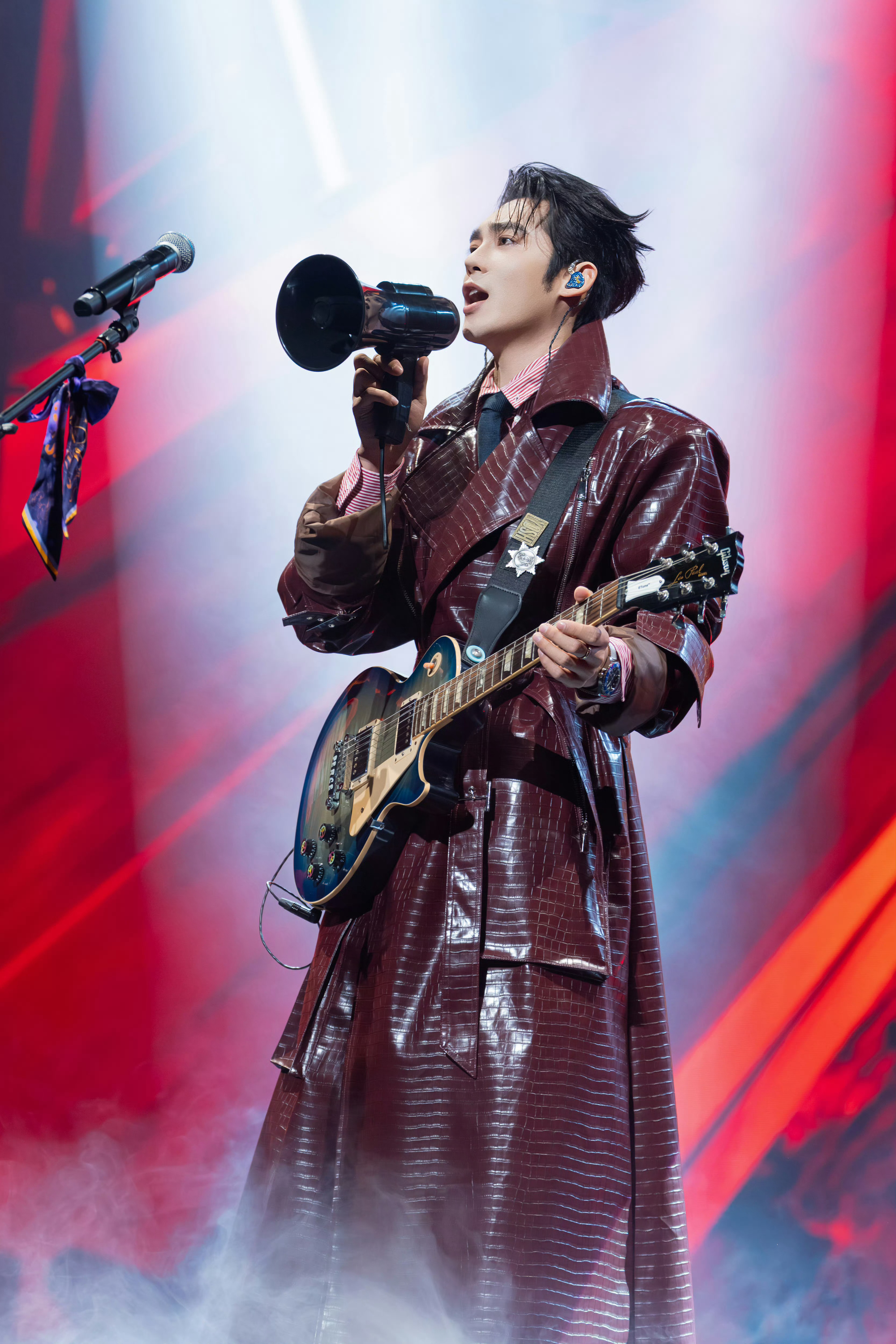 于适 「适诗」成都演唱会红色皮衣造型,内搭粉色条纹衬衫,配上利落背头,怀抱着一把