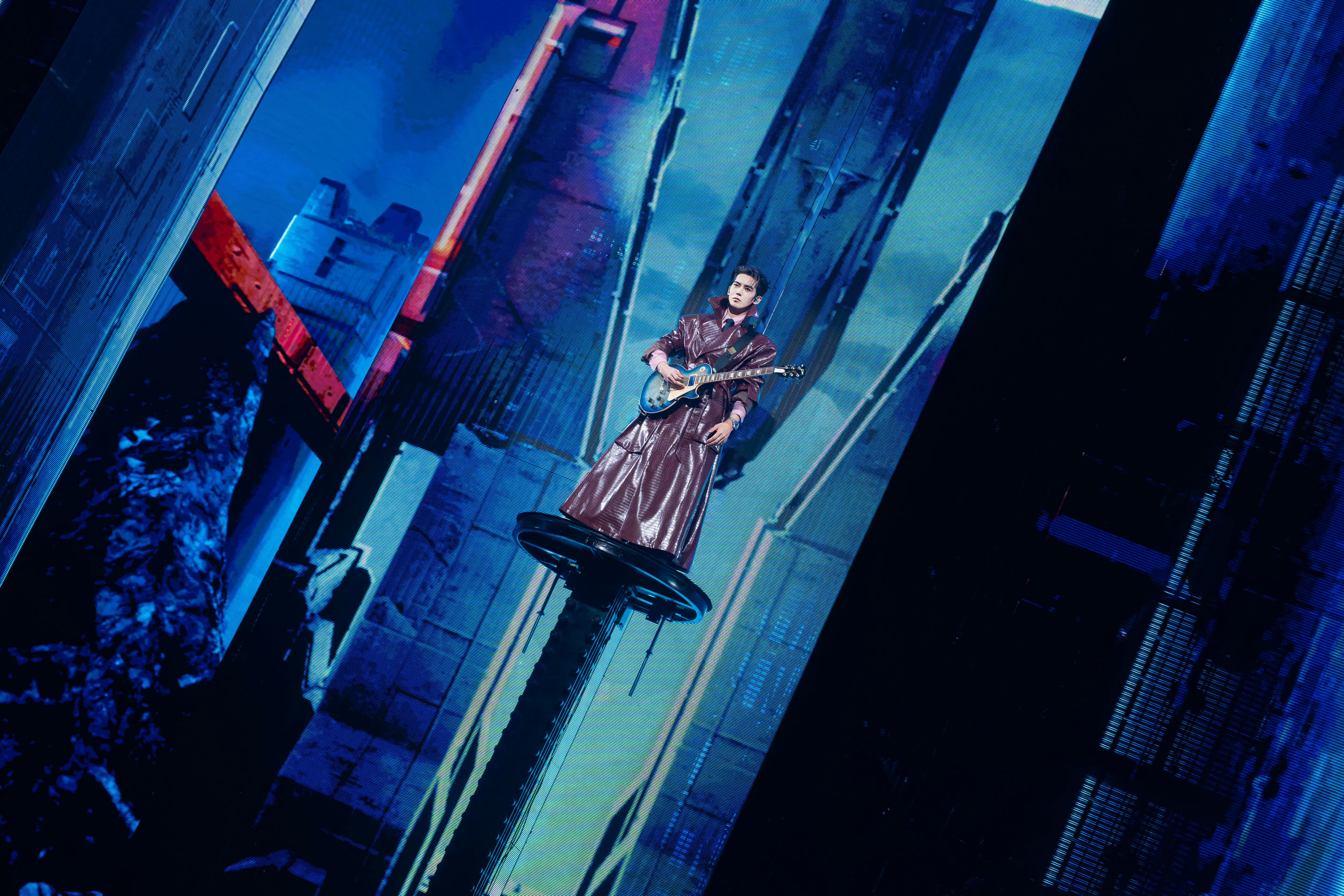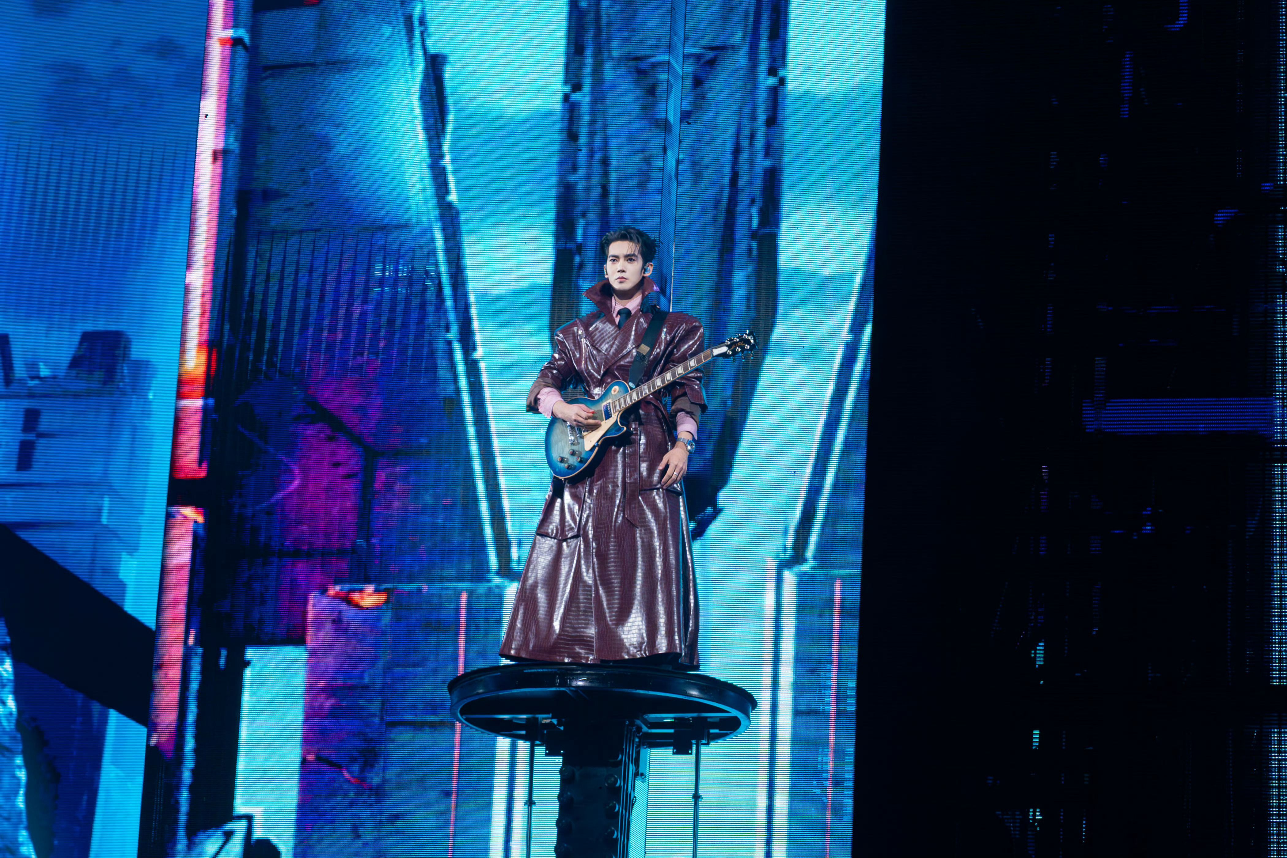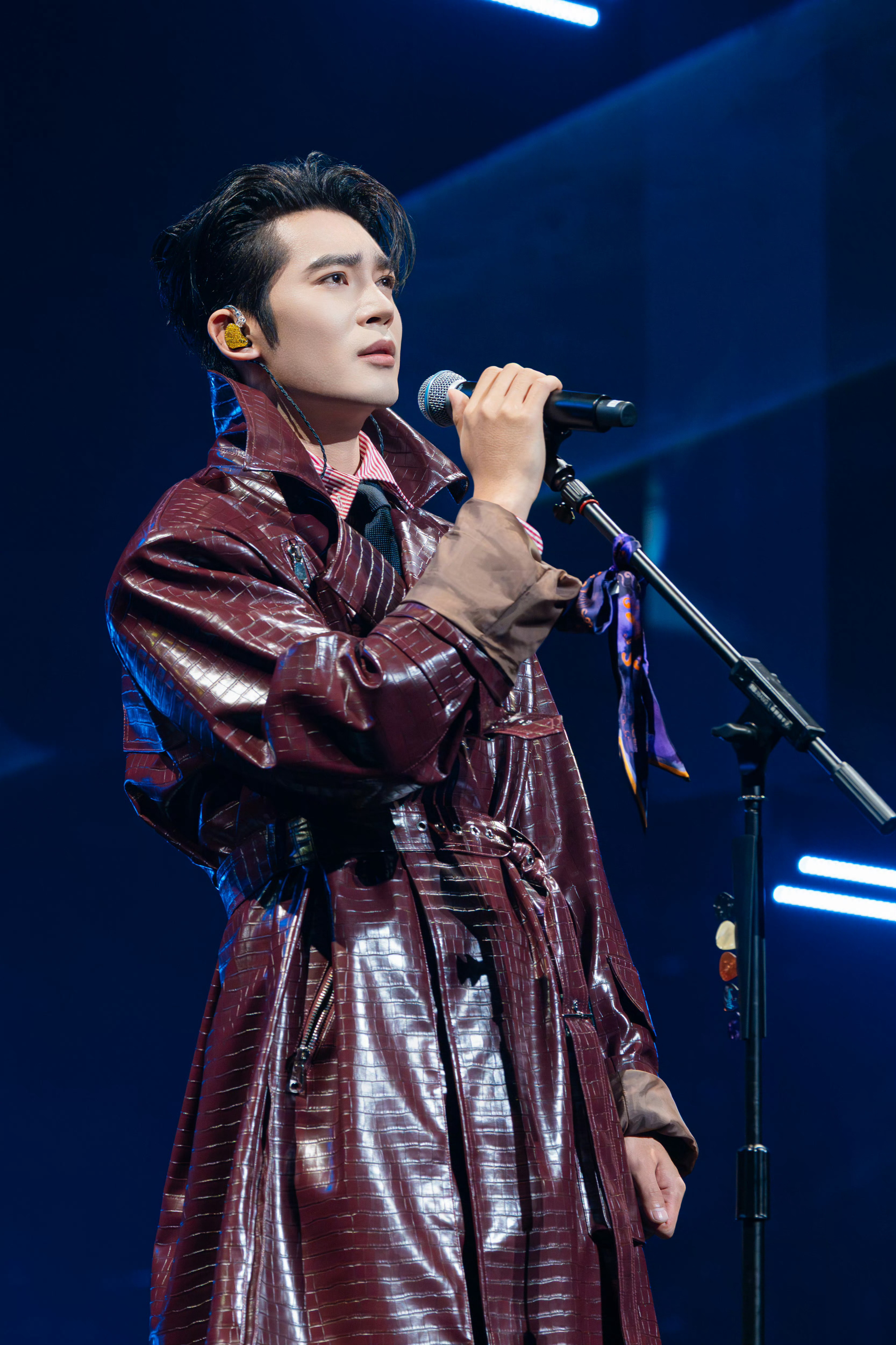 于适 「适诗」成都演唱会红色皮衣造型,内搭粉色条纹衬衫,配上利落背头,怀抱着一把