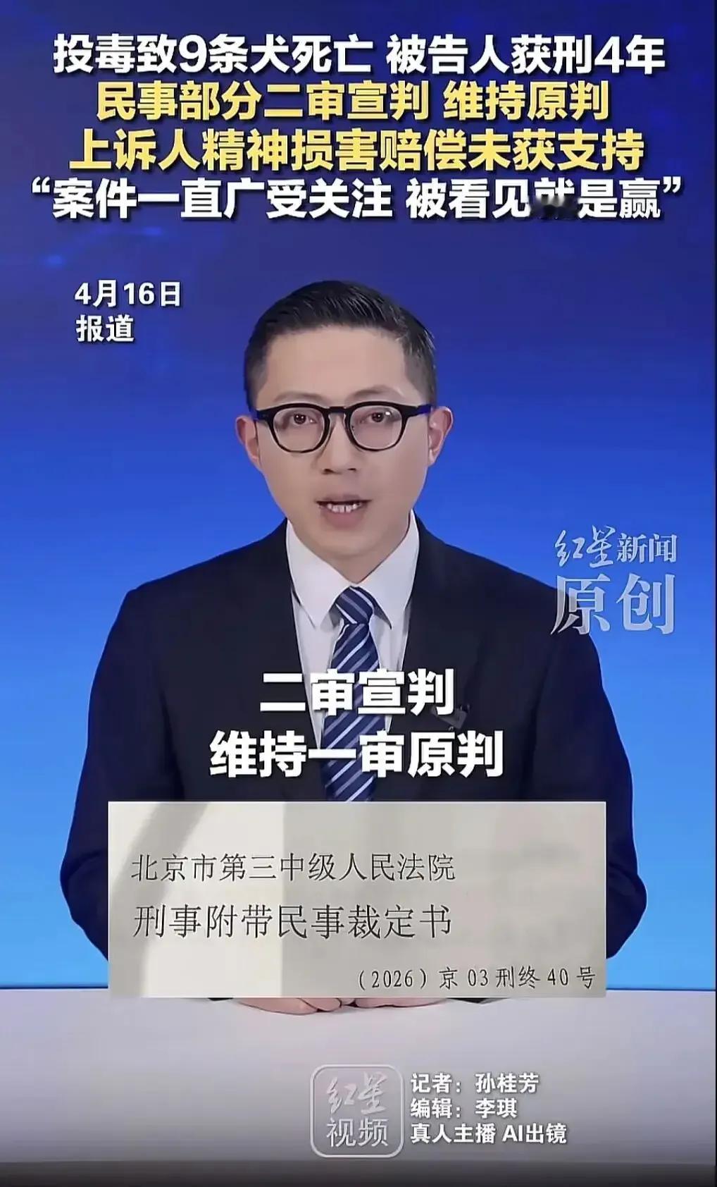 北京毒狗案案审维持原判。同时,全国又出了养狗新的规章。这也不能说明,鼓励养狗就是正确的。因为养狗人养狗的目的是取悦他自己,坑害别人,这种行为无论怎么做都是不对的,我们不应该大张旗鼓的去鼓励他,应该对他有严格的限制,无论你养什么狗,都对周边的环境及周边的邻居造成一定的伤害。首先,狗的叫声,狗的气味,狗的行为都会给周边人群带来或多或少的伤害。两口人为了取悦自己就可以伤害周边的其他人吗?无论你什么法律,都应该把人放在首位,就为了挣钱,就为了培养自私自利的养狗人,你就可以帮他们说话吗?现在的狗已经危害到了中国人的生命安全了,不应该在提倡养狗了,应该在杜绝养狗才对。