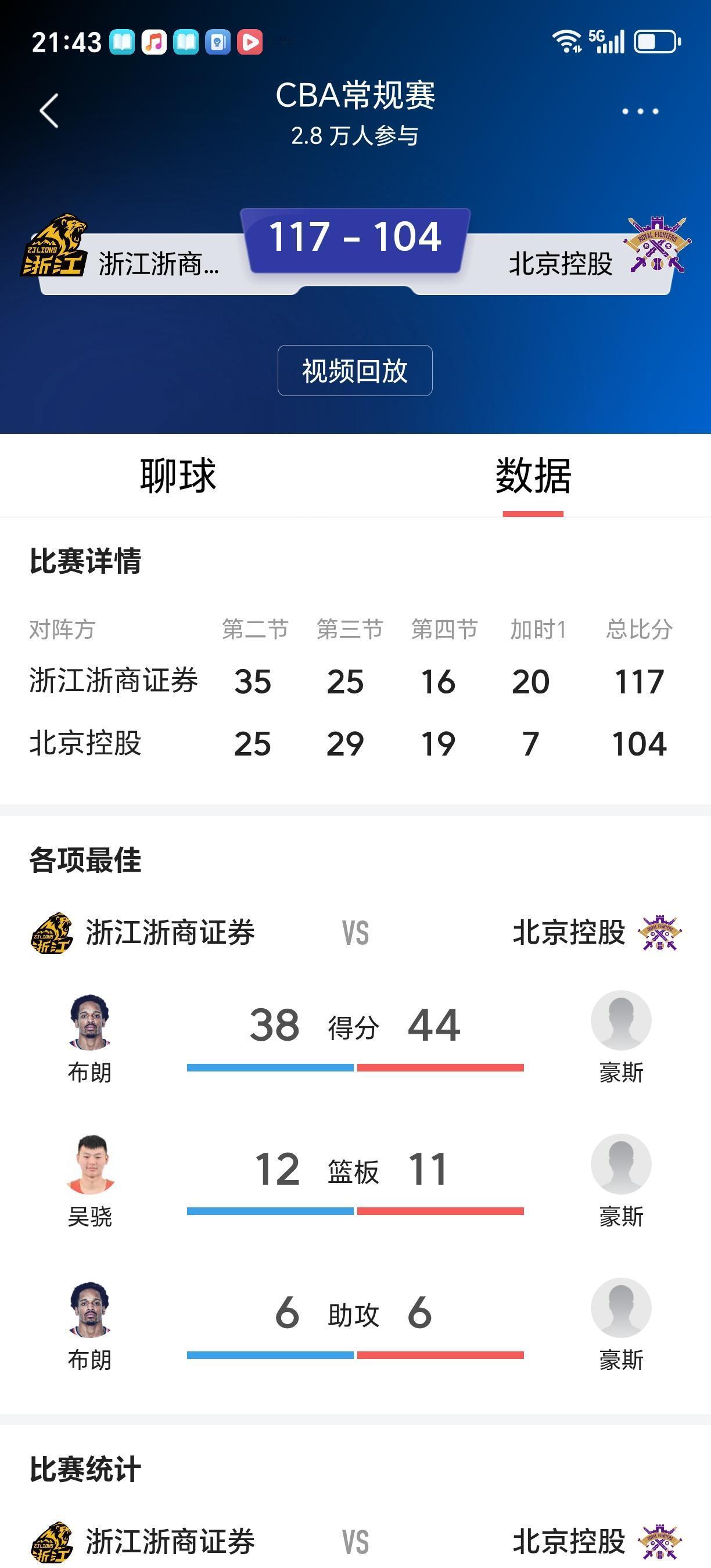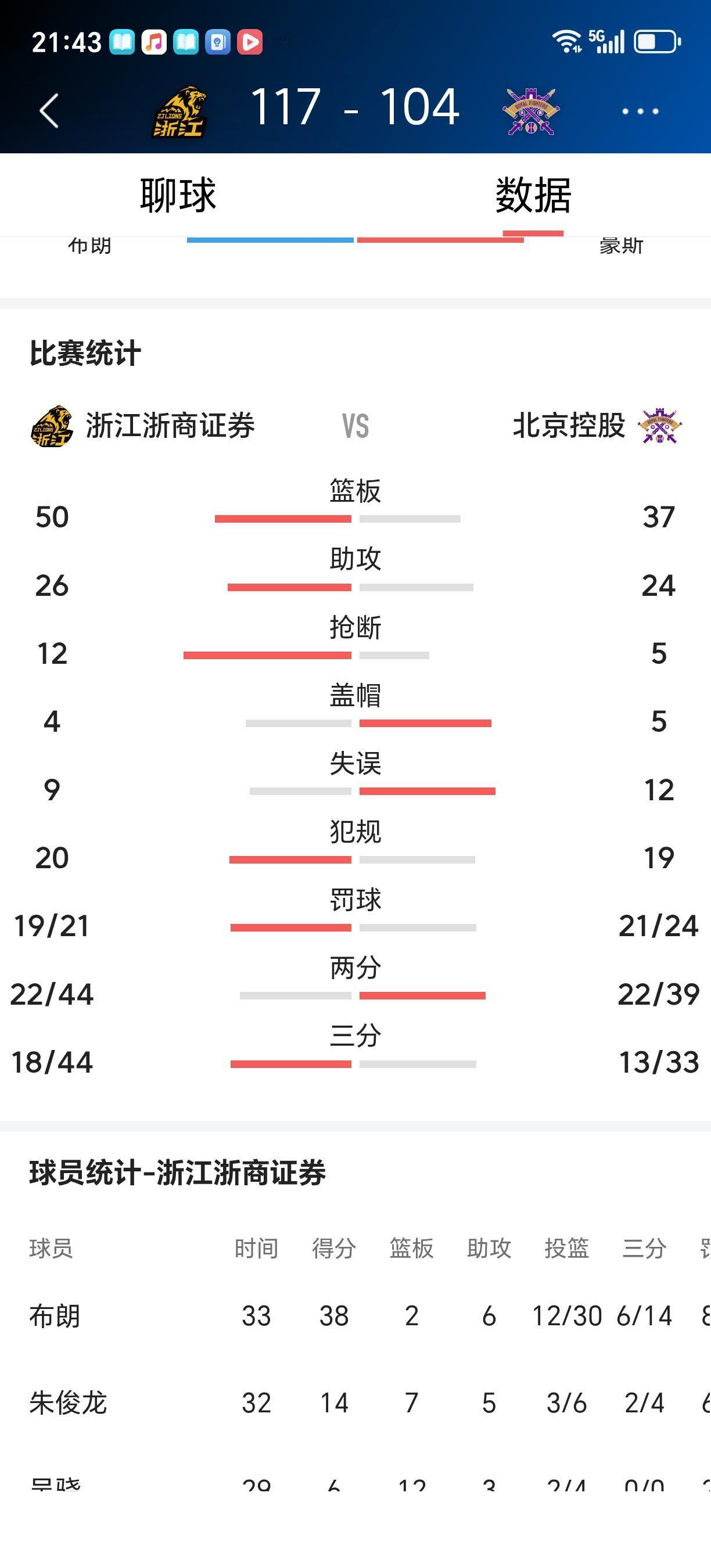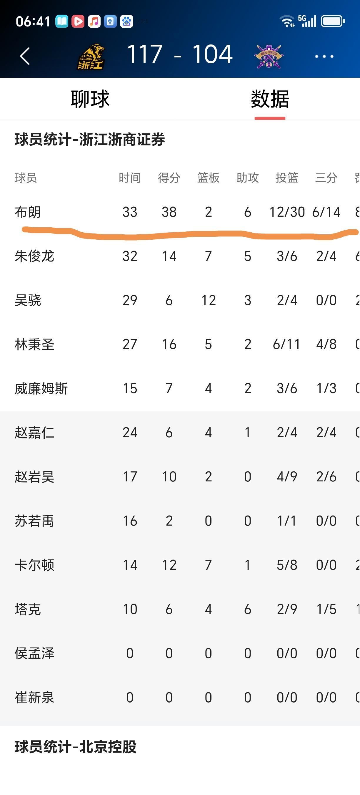 广厦国内球员朱俊龙、赵岩昊、林秉圣也有很好的发挥,广厦五人得分上双,终于通过加时赛以117:104战胜了北控。