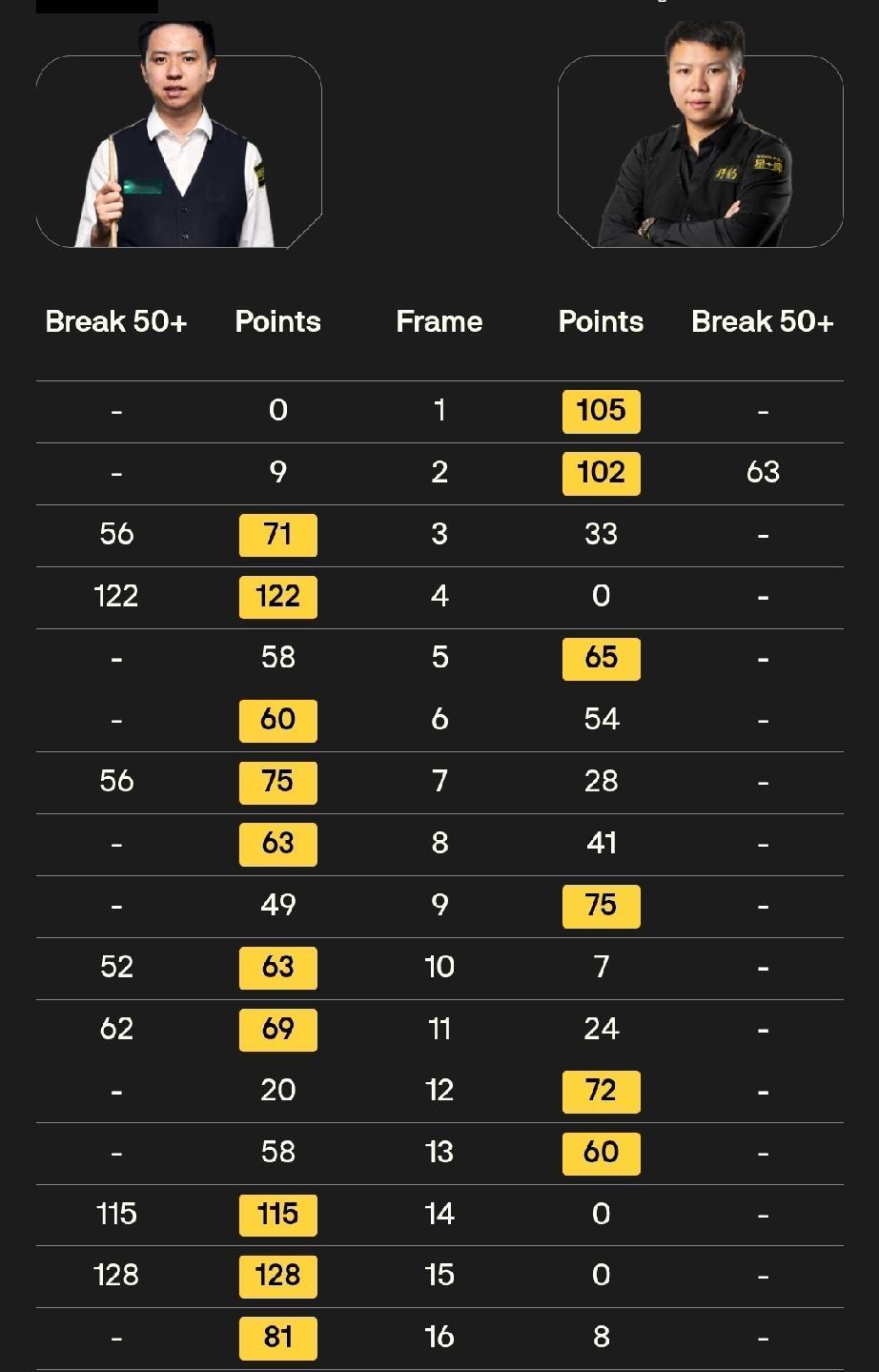 肖国栋打出单杆115分、128分,比分10-6战胜周跃龙。