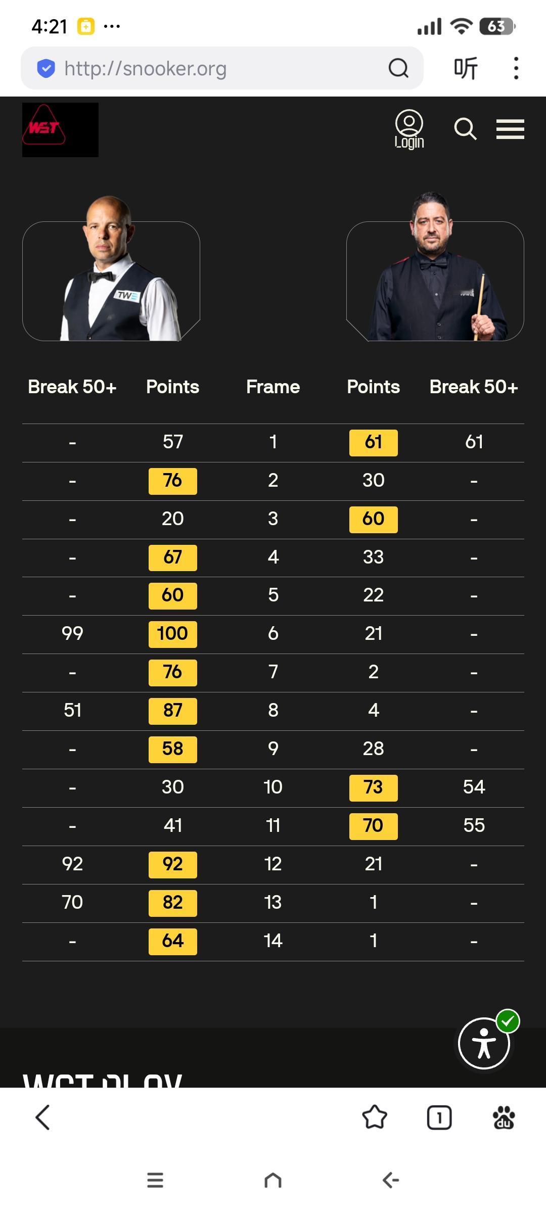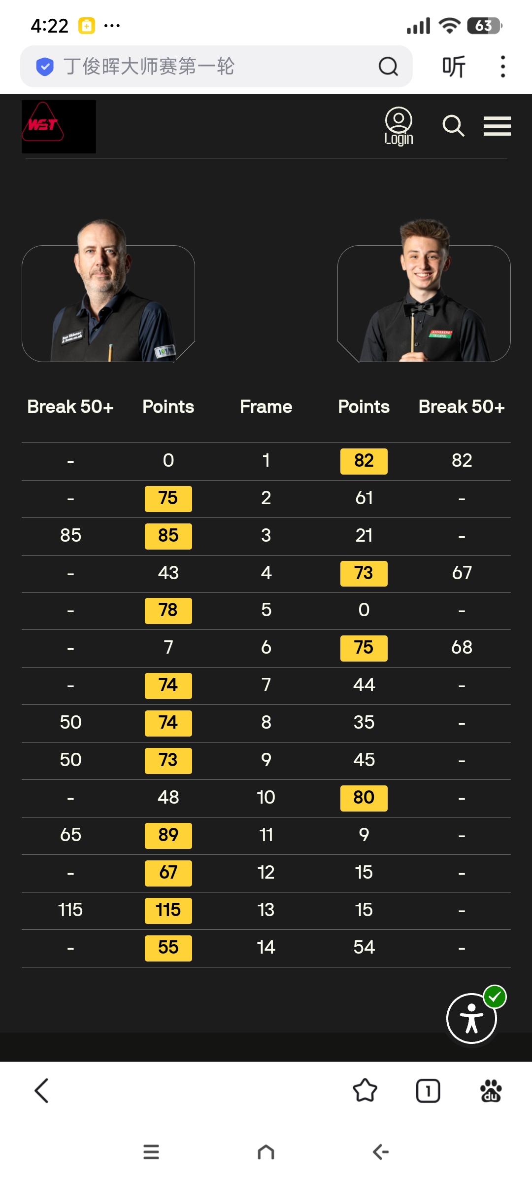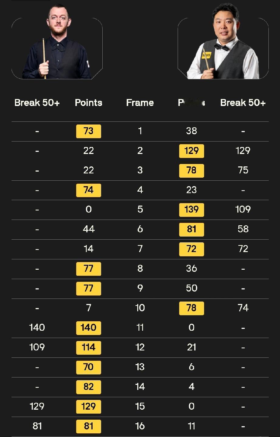 世锦赛正赛首轮战绩(截至20日6点)
