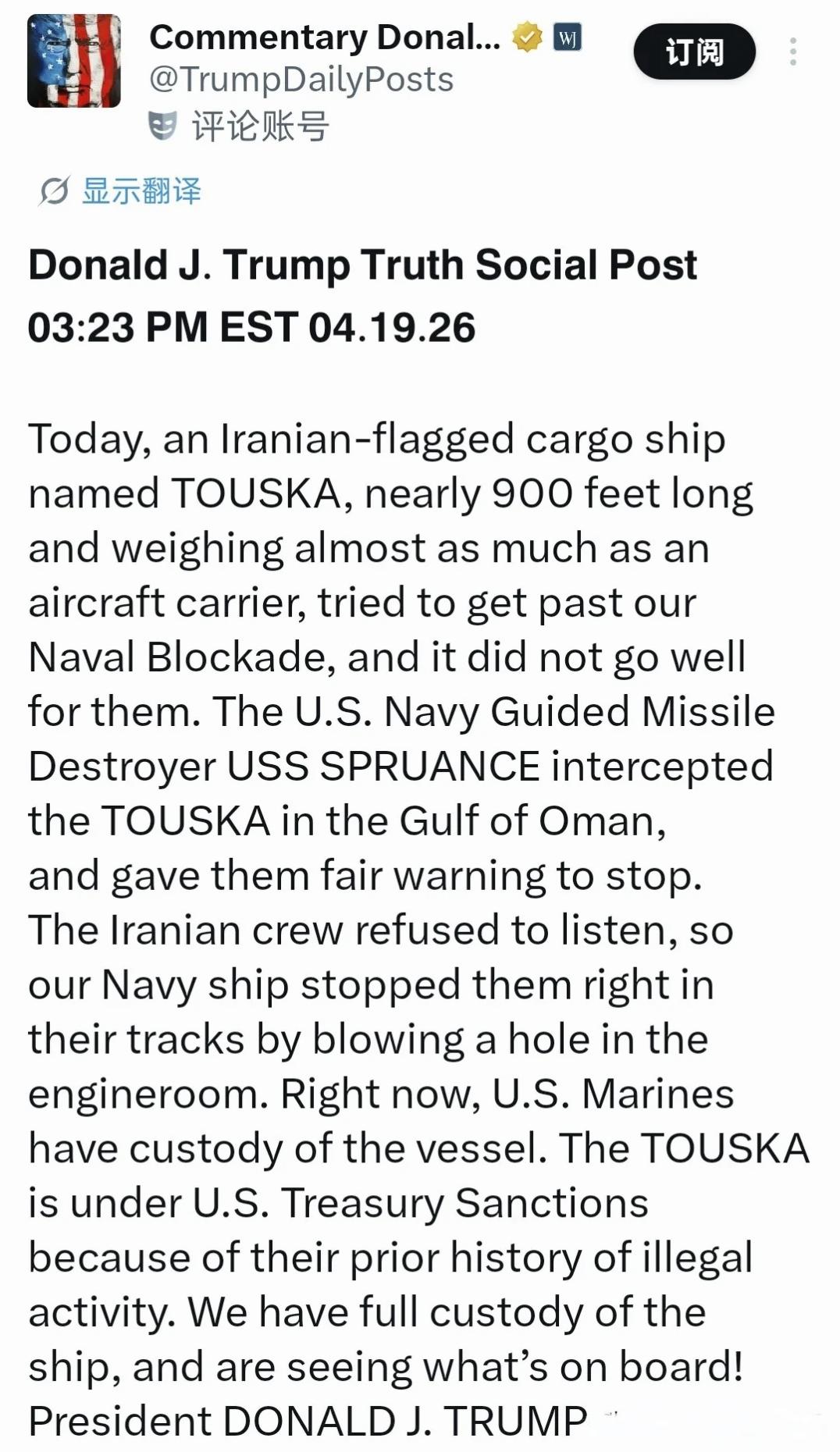 特朗普当地时间4月19日下午三点左右发文称,美国海军在阿曼湾拦截了伊朗“TOUSKA”号货轮;而且在该船拒绝配合的情况下,美军舰使用武力在该船的轮机舱上开了一个洞,让它当场瘫痪;现在美军已控制了该船。
