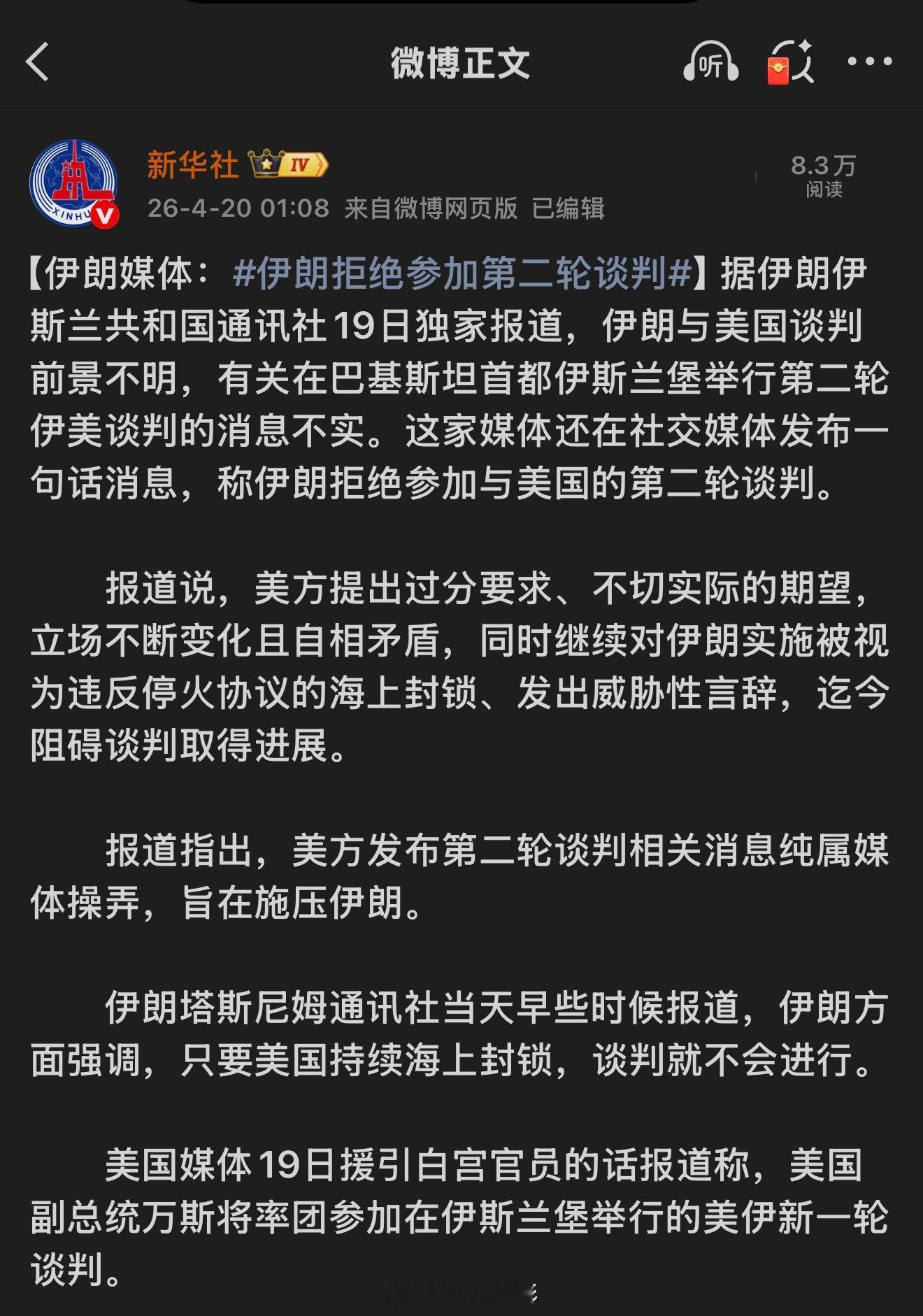 伊朗拒绝参加第二轮谈判 笑死,昨晚报道说伊朗尚未决定派遣代表团的时候,我就预感有幺蛾子了,这波是把美国脸上都扇出手印子了,特朗普怕不是要发24小时的帖子骂天骂地骂北约