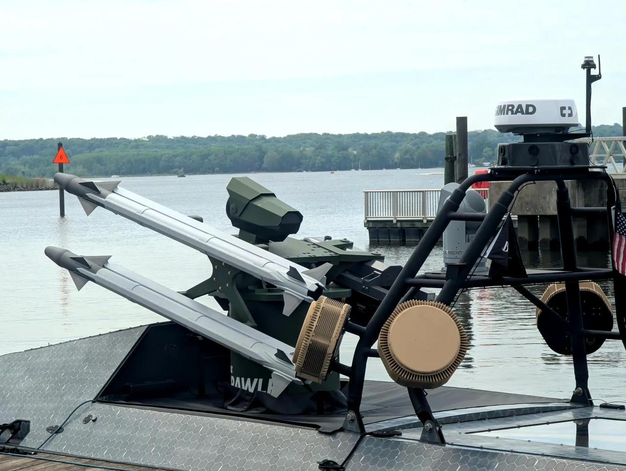 图中的“彗星”无人艇装备了AIM-9X空空导弹和“海尔法”空地/舰导弹改装的舰载版,并且还有小型化有源相控阵雷达、光电系统以及卫通天线。