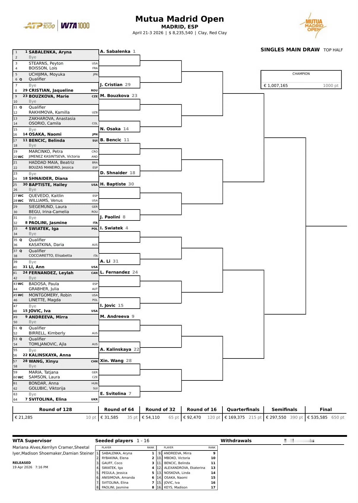 马德里站签表出炉,前八种子对位如下